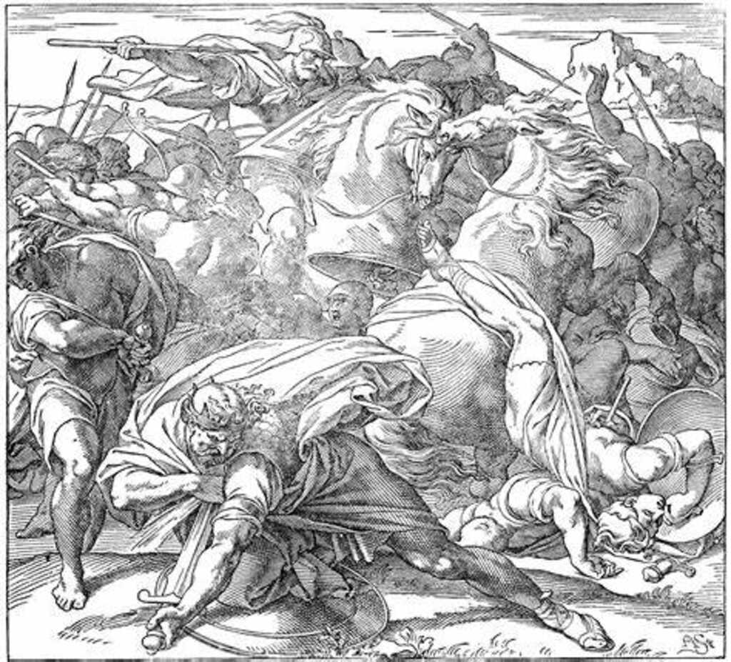 The Philistines defeat the Jews in battle. As the first stage of God’s judgment upon the Jews, He allowed the Philistines to drive deep into Jewish territory and defeat the Jews in battle: “1 Now the Philistines fought against Israel; and the men of Israel fled before the Philistines and fell slain on Mount Gilboa.” (1 Chr. 10:1; 1 Sam. 31:1). The Philistines migrated from the island of Crete (Amos 9:7) and fought with the Jews for control over the Promised Land. Saul’s son Jonathan previously fought and defeated the Philistines because of his great faith (1 Sam. 14:1-23). While Saul was King of Israel, David also killed the Philistines’ champion Goliath (1 Sam. 17:32-54). Thus, the Philistines wanted revenge. Because of Saul’s sins and his lack of faith, God removed His hand of protection. The Philistines then invaded deep into Jewish territory and assembled at Shunem. Saul then gathered his soldiers to fight the Philistines at Mount Gilboa (1 Sam. 28:4). Saul and his army had camped at Mount Gilboa (1 Sam. 28:4). The Philistines attacked the Jews in the valley of Jezreel. This same valley is also called Megiddo. In the end times, the battle of Armageddon will take place in this same location. Because he lacked faith, Saul was filled with fear at the sight of the enemy, and he became desperate when God would not answer his prayers (1 Sam. 28:5-6). He hastened God’s judgment by turning to a medium or witch to speak with Samuel (1 Sam. 28:7-18). Samuel then appeared and advised Saul that his army would be defeated, and he and his sons had one more day to live (1 Sam. 28:19). Despite being given an opportunity to repent, Saul failed to do so. The battle that followed was a fulfillment of this prophecy.