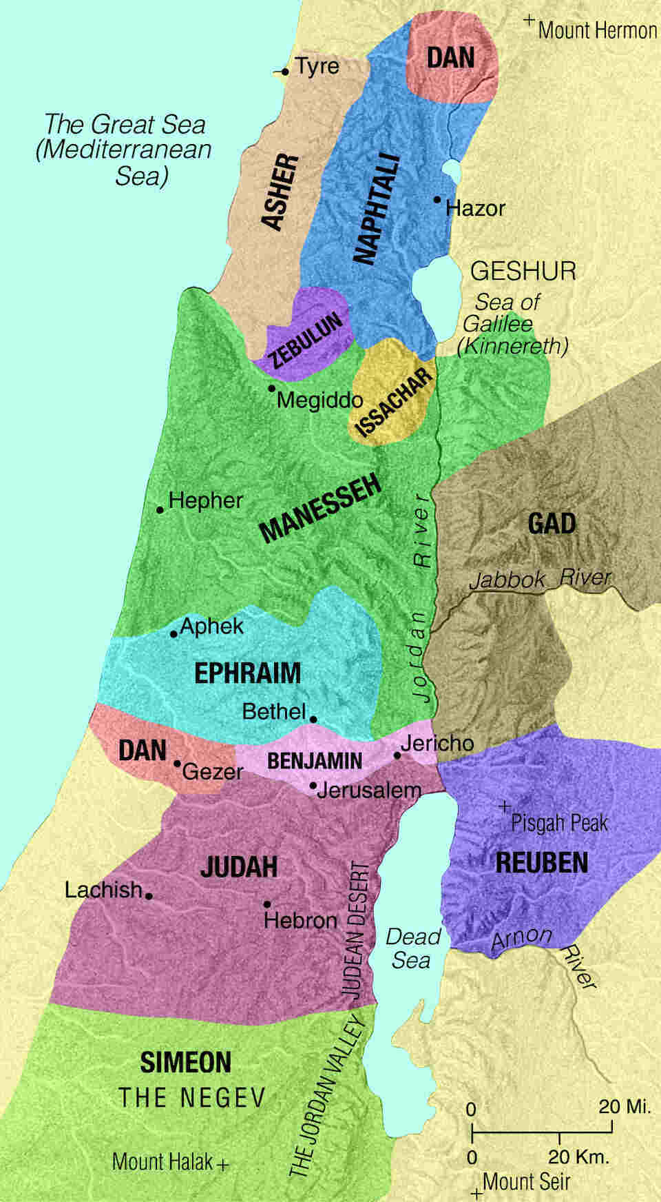Ephraim. The tribe of Ephraim was the fifth of the listed tribes from Northern Israel: “20 The sons of Ephraim were Shuthelah and Bered his son, Tahath his son, Eleadah his son, Tahath his son, 21 Zabad his son, Shuthelah his son, and Ezer and Elead whom the men of Gath who were born in the land killed, because they came down to take their livestock. 22 Their father Ephraim mourned many days, and his relatives came to comfort him. 23 Then he went in to his wife, and she conceived and bore a son, and he named him Beriah, because misfortune had come upon his house. 24 His daughter was Sheerah, who built lower and upper Beth-horon, also Uzzen-sheerah. 25 Rephah was his son along with Resheph, Telah his son, Tahan his son, 26 Ladan his son, Ammihud his son, Elishama his son, 27 Non his son and Joshua his son. 28 Their possessions and settlements were Bethel with its towns, and to the east Naaran, and to the west Gezer with its towns, and Shechem with its towns as far as Ayyah with its towns, 29 and along the borders of the sons of Manasseh, Beth-shean with its towns, Taanach with its towns, Megiddo with its towns, Dor with its towns. In these lived the sons of Joseph the son of Israel.” (1 Chr. 7:20-29). Before his death, Jacob/Israel elevated Joseph’s two oldest sons, Ephraim and Manasseh, to the status and importance of his 12 original sons (Gen. 48:5-6). Jacob/Israel spoke prophetically of a time when the Levites would become God’s priests and lose their right to a land inheritance (Dt. 18:1-2; 10:9; 12:12; Nu. 18:20). To keep the number of tribes with a land inheritance at 12, Joseph’s sons would receive a double inheritance. In addition to giving Joseph’s sons an inheritance equal to their uncles, Jacob/Israel switched the birth order of Joseph’s sons to give the second son Ephraim the greater inheritance (Gen. 48:8-14). Manasseh would have normally received a double inheritance. But that honor went to Ephraim. Ephraim’s name also means double fruit. Ephraim’s sons included Shuthelah, Bered, Tahath, Eladah, Tahath (1 Chr. 7:20). Some of his early descendants died while trying to return from Egypt to the Promised Land. Ephraim was still alive to mourn for their deaths (1 Chr. 7:21-22). These descendants apparently refused to stay in Egypt with the other descendants of Jacob/Israel. The elevated importance of their tribe caused them to feel pride. Thus, they returned prematurely to the Promised Land before God called upon them to return. The evil in Ephram’s tribe did not end there. Another descendant named Beriah committed horrific acts of evil (1 Chr. 7:23). Although many descendants were evil, God still honored those who acted with faith. For example, He honored a female descendant named Sherah, who founded a town named Beth-horon (1 Chr. 7:24). Like the story of Zelophehad’s daughters (Nu. 27:1-11), this again showed that God did not condone the sexist views of that time. He values men and women equally. Joshua, a hero of the faith and Moses’ successor, was also a member of the tribe of Ephraim (1 Chr. 7:27; Nu. 13:8, 14:6-9).
