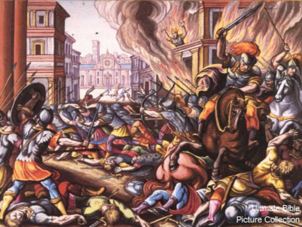 The fulfillment of God’s prophecy of instability through Zimri’s overthrow. Zimri’s victory from his violent coup gave him a reign that lasted only “seven days” before he was also thrown out of power: “15 In the twenty-seventh year of Asa king of Judah, Zimri reigned seven days at Tirzah. Now the people were camped against Gibbethon, which belonged to the Philistines. 16 The people who were camped heard it said, ‘Zimri has conspired and has also struck down the king.’ Therefore all Israel made Omri, the commander of the army, king over Israel that day in the camp. 17 Then Omri and all Israel with him went up from Gibbethon and besieged Tirzah. 18 When Zimri saw that the city was taken, he went into the citadel of the king’s house and burned the king’s house over him with fire, and died, 19 because of his sins which he sinned, doing evil in the sight of the Lord, walking in the way of Jeroboam, and in his sin which he did, making Israel sin. 20 Now the rest of the acts of Zimri and his conspiracy which he carried out, are they not written in the Book of the Chronicles of the Kings of Israel?” (1 Kgs. 16:15-20). Zimri’s seven-day reign (885 B.C.), was the shortest of any king of either Israel or Judah. Zimri seized power during a battle between the Jews and the Philistines at Gibbethon. Members of the 10 tribes of Northern Israel had no interest in allowing Zimri to govern them. Thus, they picked another military leader named Omri to challenge him. Yet, Omri would continue the vicious cycle of leaders who engaged in evil acts that surpassed their predecessors. To avoid being captured, Zimri let himself suffer one of the most painful deaths possible by allowing himself to be burned alive in his palace.