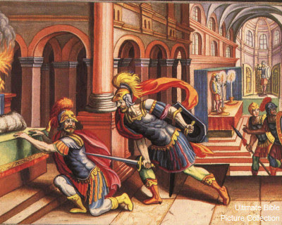 Solomon executes Joab after he refuses to obey his command. Although Solomon showed mercy to Abiathar, he served as God’s instrument of justice by executing Joab for his many crimes: “28 Now the news came to Joab, for Joab had followed Adonijah, although he had not followed Absalom. And Joab fled to the tent of the Lord and took hold of the horns of the altar. 29 It was told King Solomon that Joab had fled to the tent of the Lord, and behold, he is beside the altar. Then Solomon sent Benaiah the son of Jehoiada, saying, ‘Go, fall upon him.’ 30 So Benaiah came to the tent of the Lord and said to him, ‘Thus the king has said, ‘Come out.’’ But he said, ‘No, for I will die here.’ And Benaiah brought the king word again, saying, ‘Thus spoke Joab, and thus he answered me.’ 31 The king said to him, ‘Do as he has spoken and fall upon him and bury him, that you may remove from me and from my father’s house the blood which Joab shed without cause. 32 The Lord will return his blood on his own head, because he fell upon two men more righteous and better than he and killed them with the sword, while my father David did not know it: Abner the son of Ner, commander of the army of Israel, and Amasa the son of Jether, commander of the army of Judah. 33 So shall their blood return on the head of Joab and on the head of his descendants forever; but to David and his descendants and his house and his throne, may there be peace from the Lord forever.’ 34 Then Benaiah the son of Jehoiada went up and fell upon him and put him to death, and he was buried at his own house in the wilderness. 35 The king appointed Benaiah the son of Jehoiada over the army in his place, and the king appointed Zadok the priest in the place of Abiathar.” (1 Kgs. 2:28-35). Joab thought that he could escape judgment for his many crimes by taking hold of the horns of the altar. Yet, Joab showed that he did not know God’s Word. The refuge at God’s altar did not apply to those who committed intentional murder. “If, however, a man acts presumptuously toward his neighbor, so as to kill him craftily, you are to take him even from My altar, that he may die.” (Ex. 21:14). He murdered: (1) Abner (2 Sam. 3:6-11); (2) Uriah (2 Sam. 11:14-25); (3) Absalom (2 Sam. 18:11-15); and (4) Amasa (2 Sam. 20:8-10). He was now also guilty of treason against King David and God’s King-elect Solomon. Thus, Joab could not escape his judgment under God’s law by asking for refuge. Solomon therefore ordered Benaiah to administer the death penalty for his many crimes (1 Kgs 2:26).