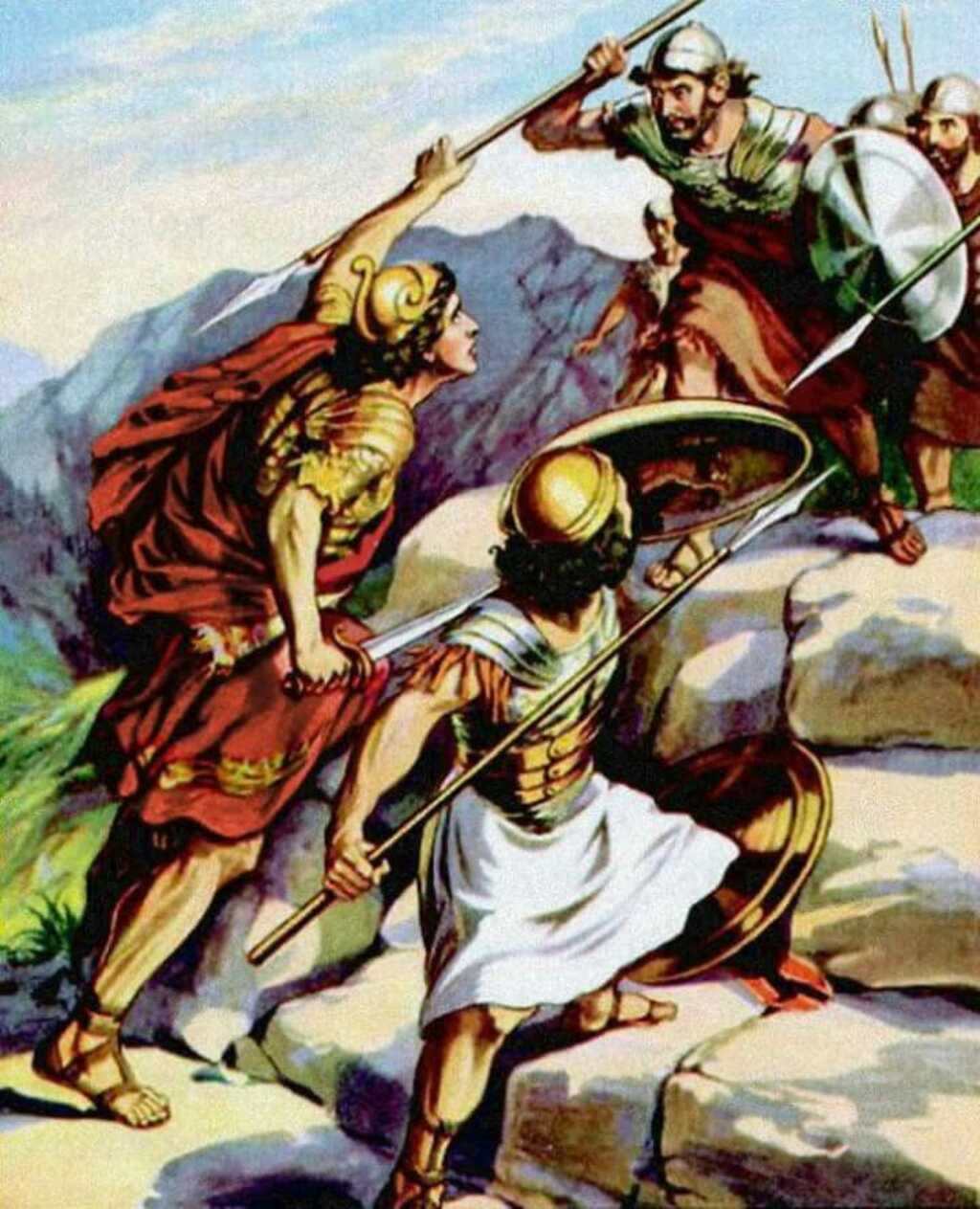Jonathan and his armor bearer encourage each other. Although Jonathan acted bravely, it is important to note that he did not act alone. Before fighting, he and his armor bearer encouraged each other. “4 Between the passes by which Jonathan sought to cross over to the Philistines’ garrison, there was a sharp crag on the one side and a sharp crag on the other side, and the name of the one was Bozez, and the name of the other Seneh. 5 The one crag rose on the north opposite Michmash, and the other on the south opposite Geba. 6 Then Jonathan said to the young man who was carrying his armor, ‘Come and let us cross over to the garrison of these uncircumcised; perhaps the Lord will work for us, for the Lord is not restrained to save by many or by few.’ 7 His armor bearer said to him, ‘Do all that is in your heart; turn yourself, and here I am with you according to your desire.’” (1 Sam 14:4-7). Satan is a roaring lion (1 Pet. 5:8) and God’s people are called “sheep,” animals without natural defenses (e.g., Jo. 21:16, 27). Thus, like Jonathan and his squire, believers are called upon to encourage and protect each other.