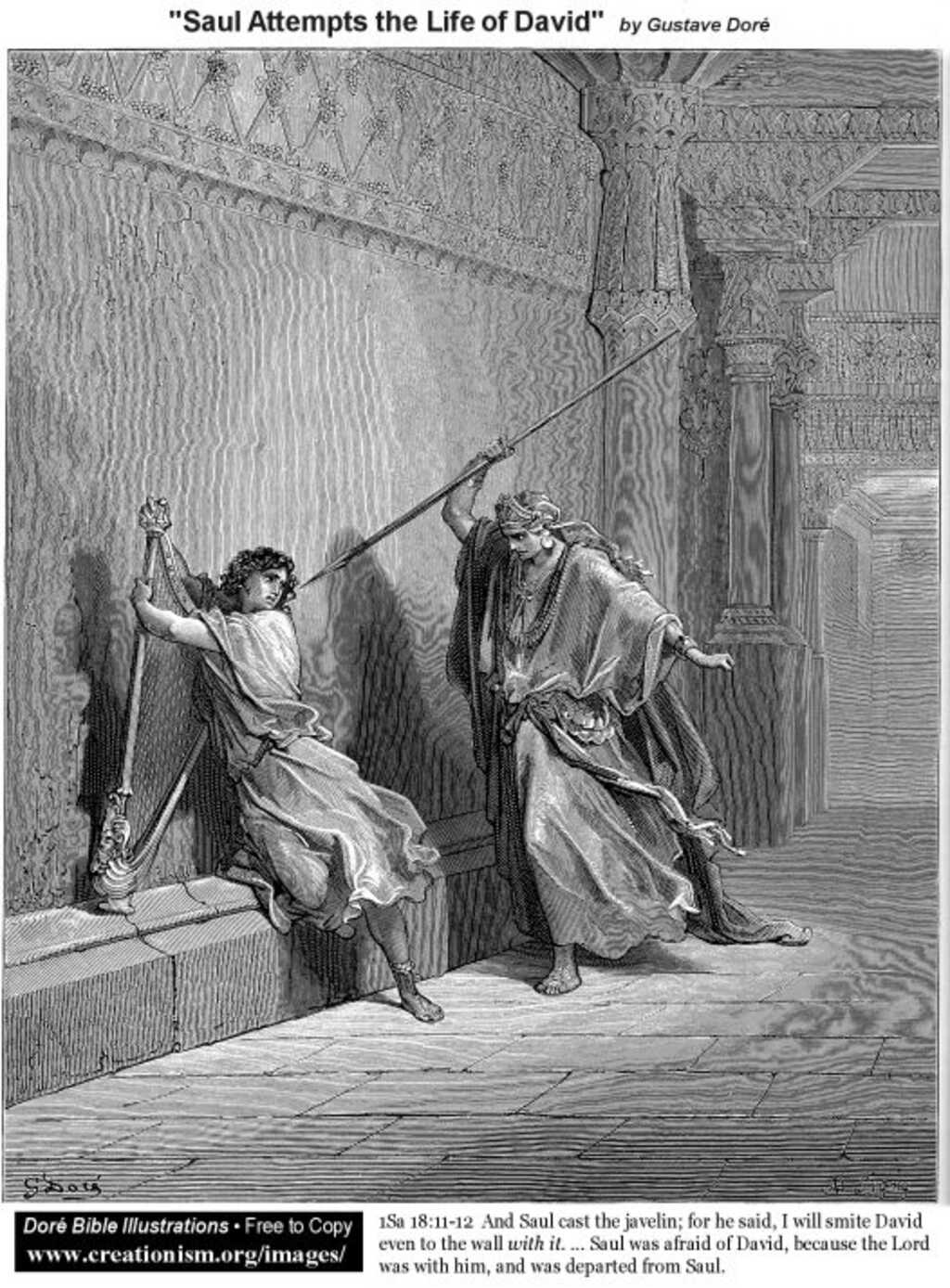 Saul tries to kill David for the third time, but David escapes. Saul’s vow was not rooted in any fear of God. Thus, the moment David became successful again in combat, Saul’s jealousy returned, and he broke his vow and tried to kill David. “8 When there was war again, David went out and fought with the Philistines and defeated them with great slaughter, so that they fled before him. 9 Now there was an evil spirit from the Lord on Saul as he was sitting in his house with his spear in his hand, and David was playing the harp with his hand. 10 Saul tried to pin David to the wall with the spear, but he slipped away out of Saul’s presence, so that he stuck the spear into the wall. And David fled and escaped that night.” (1 Sam. 19:8-10). This was sadly the third time that Saul tried to kill David out of jealousy. “10 Now it came about on the next day that an evil spirit from God came mightily upon Saul, and he raved in the midst of the house, while David was playing the harp with his hand, as usual; and a spear was in Saul’s hand. 11 Saul hurled the spear for he thought, ‘I will pin David to the wall.’ But David escaped from his presence twice.” (1 Sam. 18:10-11). The fact that David remained and trusted Saul after two spear attacks and his directions to others to kill him testifies to his incredible loyalty. David previously calmed Saul’s heart and drove away the evil spirit through worship music (1 Sam. 16:15-23). David tried to again calm Saul’s troubled soul with worship music (1 Sam. 19:10). But this failed because David was the source of Saul’s jealousy.