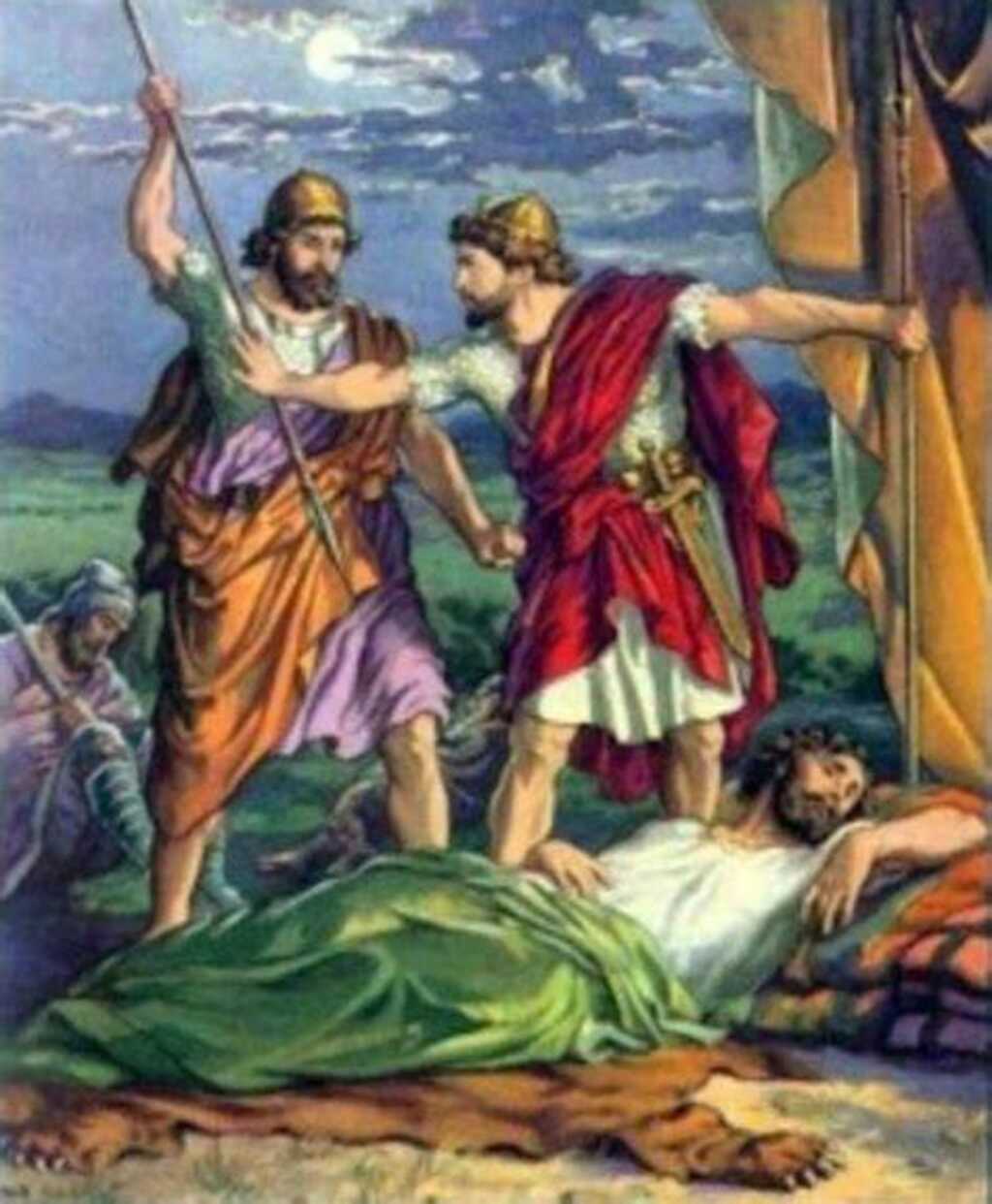 David’s second opportunity to kill Saul. God previously tested David when He delivered Saul into his hands in a cave in which David’s men hid (1 Sam. 24:2-3). This time, God would deliver Saul only after David acted in faith by walking with only one other soldier, his nephew Abishai (1 Chron. 2:15-16), into Saul’s sleeping army of 3,000 men: “3 Saul camped in the hill of Hachilah, which is before Jeshimon, beside the road, and David was staying in the wilderness. When he saw that Saul came after him into the wilderness, 4 David sent out spies, and he knew that Saul was definitely coming. 5 David then arose and came to the place where Saul had camped. And David saw the place where Saul lay, and Abner the son of Ner, the commander of his army; and Saul was lying in the circle of the camp, and the people were camped around him. 6 Then David said to Ahimelech the Hittite and to Abishai the son of Zeruiah, Joab’s brother, saying, ‘Who will go down with me to Saul in the camp?’ And Abishai said, ‘I will go down with you.’ 7 So David and Abishai came to the people by night, and behold, Saul lay sleeping inside the circle of the camp with his spear stuck in the ground at his head; and Abner and the people were lying around him. 8 Then Abishai said to David, ‘Today God has delivered your enemy into your hand; now therefore, please let me strike him with the spear to the ground with one stroke, and I will not strike him the second time.’” (1 Sam. 26:3-8). Previously, God brought Saul into a cave to relieve himself in which David’s men were hiding. At that time, one of David’s associates wanted to kill Saul (1 Sam 24:4). In the cave, David’s servant used almost the same words that Abishai used here: “4 ‘Behold, this is the day of which the Lord said to you, ‘Behold; I am about to give your enemy into your hand, and you shall do to him as it seems good to you.’”’ (1 Sam. 24:4). Faced with the last test, David did not want to face God’s judgment for murdering His anointed king. Thus, he merely cut a corner of the king’s robe, something which also caused him to feel remorse (1 Sam. 24:5). Here, Abishai gave David the chance to again kill the king without feeling any guilt. Abishai was willing to take the blame and even use the same spear that Saul had thrown at David on three prior occasions (1 Sam. 18:10-11; 19:9-10). Abishai was a loyal soldier of David who would in future offer to kill David’s enemies after he became king. “Then Abishai the son of Zeruiah said to the king, ‘Why should this dead dog curse my lord the king? Let me go over now and cut off his head.’” (2 Sam. 16:9). Yet, thanks to God’s testing here, David would later show mercy as Israel’s king.