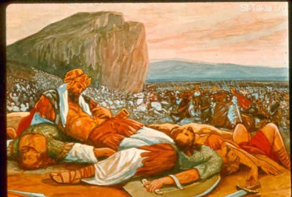 The Philistines kill three of Saul’s sons. After witnessing the defeat of his army, Saul then witnesses the death of his three sons: “2 The Philistines overtook Saul and his sons; and the Philistines killed Jonathan and Abinadab and Malchi-shua the sons of Saul.” (1 Sam. 31:2; 1 Chron. 10:2). These were three of his four sons. (1 Sam. 14:49). Their deaths were necessary to ensure David’s kingship. Jonathan was innocent of any crimes. He was even willing to submit to David (1 Sam. 18:1-4). But his brothers would not do so. One brother, Ish-bosheth, would survive and later challenge David’s claim to the throne (2 Sam. 2:8-4:12).