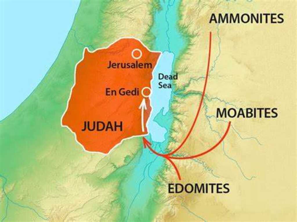 Armies assemble against Judah, and Jehoshaphat proclaims a fast to seek God. After Jehoshaphat was nearly killed for fighting a war with Northern Israel against Assyria that God did not sanction, Judah faced a combined invading army from Ammon, Moab, and some Meunites: “1 Now it came about after this that the sons of Moab and the sons of Ammon, together with some of the Meunites, came to make war against Jehoshaphat. 2 Then some came and reported to Jehoshaphat, saying, ‘A great multitude is coming against you from beyond the sea, out of Aram and behold, they are in Hazazon-tamar (that is Engedi).’ 3 Jehoshaphat was afraid and turned his attention to seek the Lord, and proclaimed a fast throughout all Judah. 4 So Judah gathered together to seek help from the Lord; they even came from all the cities of Judah to seek the Lord.” (2 Chr. 20:1-4). Jehoshaphat was filled with fear because he recognized that he was a sinner and could not pridefully claim that God had a duty to deliver him. Without consulting God, he formed a marriage alliance with Ahab, the evil King of Northern Israel (2 Chr. 18:1). Also without consulting God, he formed a military alliance with Ahab against Assyria (2 Chr. 18:1-3; 1 Kgs. 22:1-4). He then ignored God’s prophet Micaiah when he warned against going to war with the Assyrians (2 Chr. 18:12-16; 1 Kgs. 22:13-17) and instead listened to Ahab’s 400 false prophets, who all incorrectly predicted victory (2 Chr. 18:5-11; 1 Kgs. 22:6-12). Finally, he said nothing after a false prophet struck Micaiah, and Ahab threw him into prison, where he was tortured (2 Chr. 18:23-27; 1 Kgs. 22:24-28). Because Ahab was disobedient, he died in battle, just as Micaiah had foretold (2 Chr. 18:33-34). But God showed mercy and grace to Jehoshaphat only because he cried out to Him for deliverance (2 Chr. 18:31-32). Thus, he led the entire nation in humble prayer, fasting, and repentance. As a young boy, he would have seen God deliver his father, King Asa, from an invading army of more than a million Ethiopian soldiers (2 Chr. 14:9-15). He had the faith to know that God could deliver His people again.