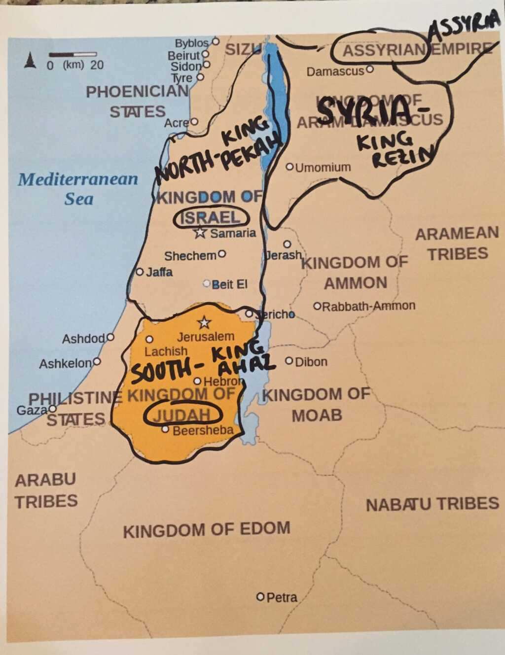 God allowed Judah to be defeated and taken into bondage. Because Ahaz turned his back on God, God removed His hand of protection and allowed the pagan King Rezin of Aram and King Pekah of Northern Israel to attack and defeat Judah: “5 Wherefore, the Lord his God delivered him into the hand of the king of Aram; and they defeated him and carried away from him a great number of captives and brought them to Damascus. And he was also delivered into the hand of the king of Israel, who inflicted him with heavy casualties. 6 For Pekah the son of Remaliah slew in Judah 120,000 in one day, all valiant men, because they had forsaken the Lord God of their fathers. 7 And Zichri, a mighty man of Ephraim, slew Maaseiah the king’s son and Azrikam the ruler of the house and Elkanah the second to the king. 8 The sons of Israel carried away captive of their brethren 200,000 women, sons and daughters; and they took also a great deal of spoil from them, and brought the spoil to Samaria.” ” (2 Chr. 28:5-8; 2 Kgs. 16:5-6). There was a cost for Judah’s decision to live without God. By trying to rely upon their own strength and not in God’s strength, Judah lost 120,000 soldiers in just one day and 200,000 women and children as captives. God further allowed the Syrians to capture the important port of Elath in the northern tip of the Gulf of Aqaba (2 Kgs. 16:6). God revealed through the prophet Isaiah that the two kings sought to place a puppet king in Judah: “Because Aram, with Ephraim and the son of Remaliah, has planned evil against you, saying, let us go up against Judah and terrorize it, and make for ourselves a breach in its walls and set up the son of Tabeel as king in the midst of it,” (Is. 7:5-6). The two sides sought to force Judah into their alliance against the Assyrian empire.