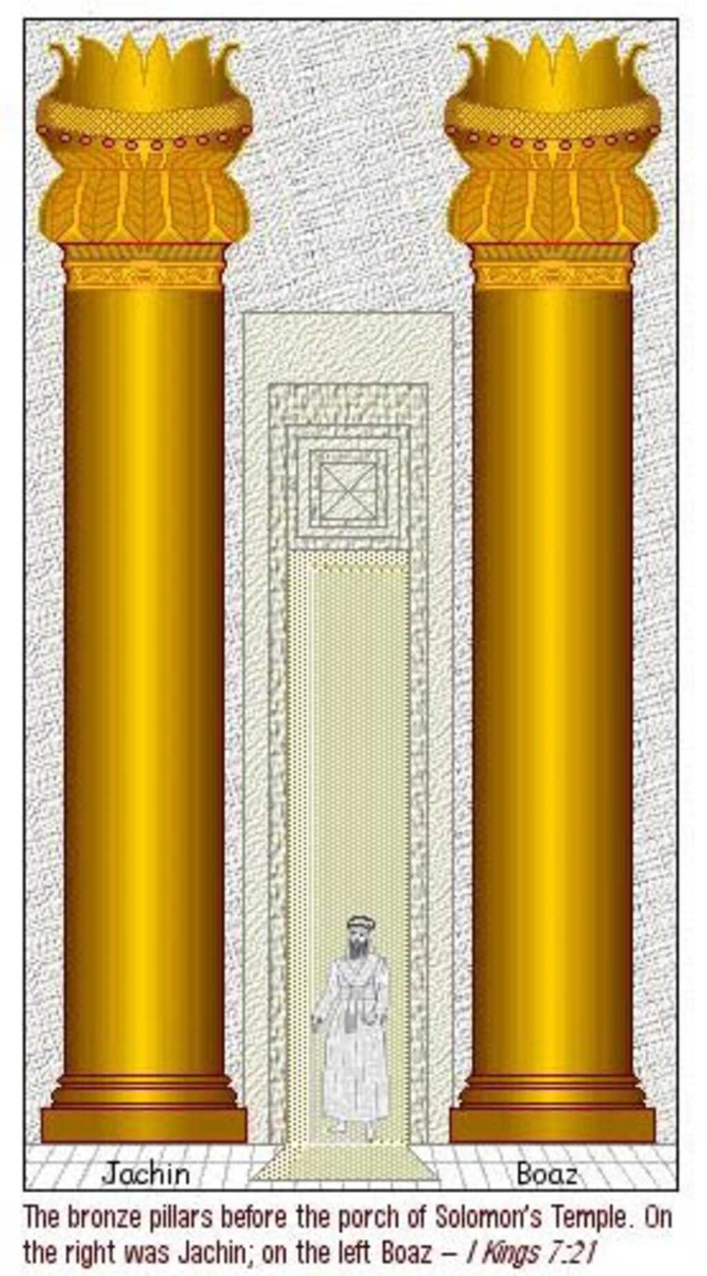 The external pillars. Finally, Solomon built the Temple with two large pillars to welcome all who sought to be reconciled with God: “15 He also made two pillars for the front of the house, thirty-five cubits high, and the capital on the top of each was five cubits. 16 He made chains in the inner sanctuary and placed them on the tops of the pillars; and he made one hundred pomegranates and placed them on the chains. 17 He erected the pillars in front of the temple, one on the right and the other on the left, and named the one on the right Jachin and the one on the left Boaz.” (2 Chr. 3:15-17). This passage describes two bronze pillars in front of the porch leading to the Temple. Assuming a cubit was 18 inches in length, each pillar was 27 feet high and 18 feet in circumference (1 Kgs. 7:15). On top of each pillar were identical bronze finials called “chapiters” (1 Kgs. 7:16). Each chapiter had structures and chains emanating from it like tree branches with chains, lilies, and pomegranates. Pomegranates were one of the fruits that God promised in the Promised Land (Nu. 13:23; Dt. 8:8). Any person entering the Temple passed between these two pillars. In a similar way, there is only one path that leads to God. It also symbolized the universal salvation offered to both Jews and gentiles.