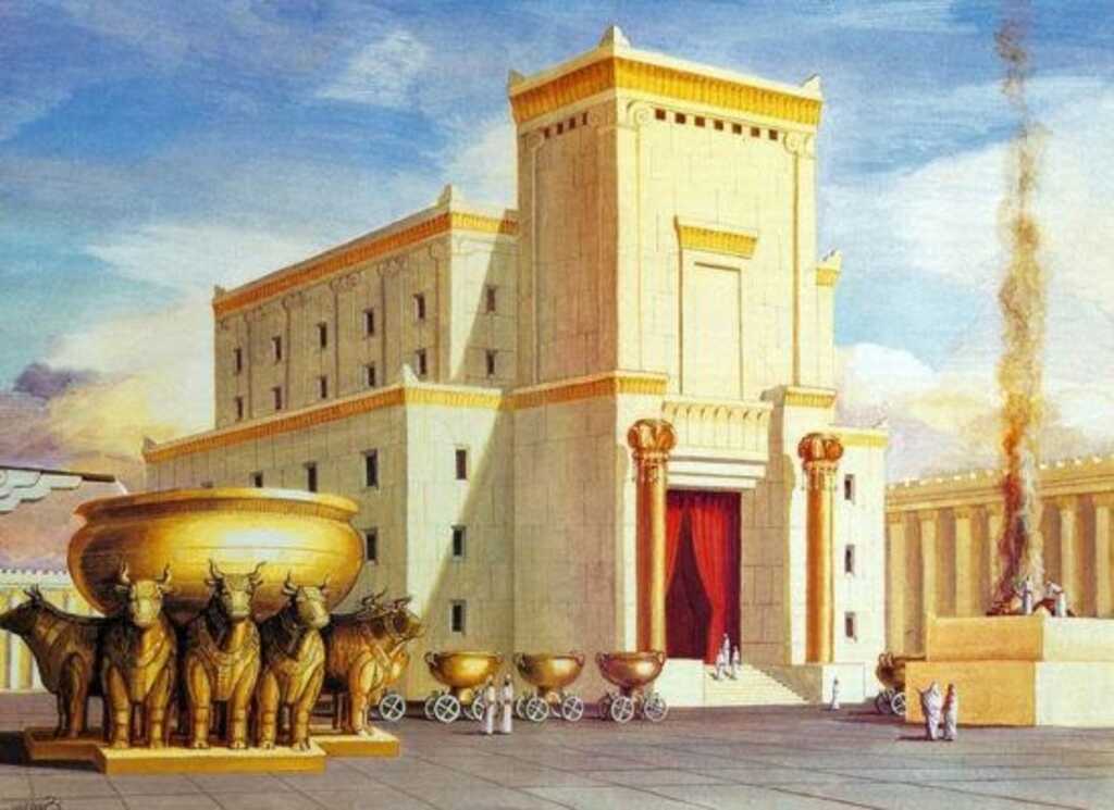 The metal sea. The Temple courtyard also included a large metal sea basins to cleanse both the burnt offerings and the priests who prepared the sacrifices: “2 Also he made the cast metal sea, ten cubits from brim to brim, circular in form, and its height was five cubits and its circumference thirty cubits. 3 Now figures like oxen were under it and all around it, ten cubits, entirely encircling the sea. The oxen were in two rows, cast in one piece. 4 It stood on twelve oxen, three facing the north, three facing west, three facing south and three facing east; and the sea was set on top of them and all their hindquarters turned inwards. 5 It was a handbreadth thick, and its brim was made like the brim of a cup, like a lily blossom; it could hold 3,000 baths. 6 He also made ten basins in which to wash, and he set five on the right side and five on the left to rinse things for the burnt offering; but the sea was for the priests to wash in.” (2 Chr. 4:2-6). The “molten sea” was a bronze basin that was 7 and a half feet deep and 45 feet in circumference. It held between 11,500 and 14,000 gallons of water (2 Chr. 4:5) and was supported by 12 bronze bulls (2 Chr. 4:6). They faced in every compass direction (1 Kgs. 7:25). The sea took the place of the bronze laver in the Tabernacle, which was used for rinsing during the sacrifices (Ex. 30:17-21). King Ahaz later replaced these with a stone base (2 Kgs. 16:17). The sea also served the important role of keeping the priests pure for service.