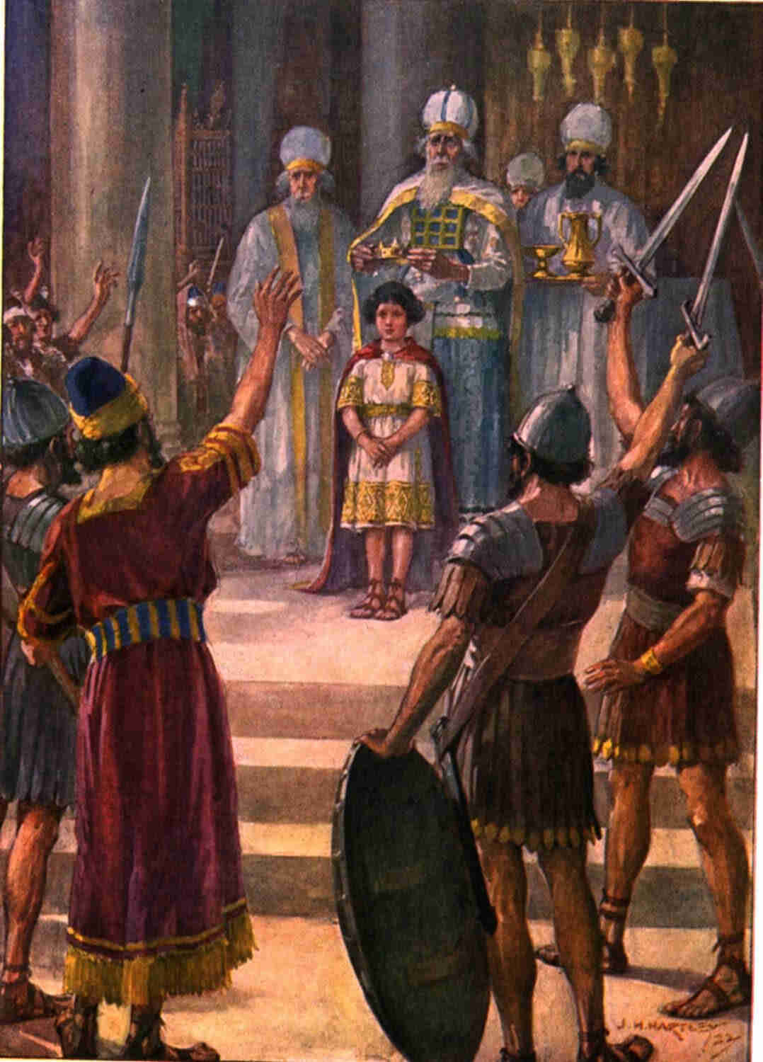 Queen Athaliah tries to eliminate the line of David, but a priest hides Joash from her. After Queen Athaliah learned that her son King Ahaziah had been put to death (2 Kgs. 9:27-29), she committed an unspeakable act of maternal filicide to seize power for herself: “1 When Athaliah the mother of Ahaziah saw that her son was dead, she rose and destroyed all the royal offspring. 2 But Jehosheba, the daughter of King Joram, sister of Ahaziah, took Joash the son of Ahaziah and stole him from among the king’s sons who were being put to death, and placed him and his nurse in the bedroom. So they hid him from Athaliah, and he was not put to death. 3 So he was hidden with her in the house of the Lord six years, while Athaliah was reigning over the land.” (2 Kgs. 11:1-3). Athaliah was the daughter of Ahab and Jezebel (2 Kgs. 8:26). King Jehoshaphat of Judah decided that it was more important to unite Judah and Northern Israel than to keep Judah pure. Thus, he arranged for his son Jehoram to marry Athaliah (2 Kgs. 11:1). Yet, this was a monumental mistake. Athaliah introduced Baal and Astarte worship to Judah (2 Kgs. 11:1-16; 2 Chr. 21:6; 22:10 - 23:15) the same way that Jezebel introduced Baal and Astarte worship to Northern Israel (1 Kgs. 16:31-33; 21:25). Because of Athaliah’s evil influence, her son Ahaziah also became a Baal worshipper (2 Chron. 22:8). “He walked in the way of the house of Ahab and did evil in the sight of the Lord, like the house of Ahab had done, . . .” (2 Kgs. 8:27). God judged Ahaziah with a short one-year reign (2 Kgs. 8:26). God also commissioned the general Jehu to kill him as part of God’s plan to eradicate Baal worship from the 12 tribes of Israel: “Now the destruction of Ahaziah was from God, in that he went to Joram. For when he came, he went out with Jehoram against Jehu the son of Nimshi, whom the LORD had anointed to cut off the house of Ahab.” (2 Chron. 22:7). Because Ahaziah also stumbled God’s people with Baal worship, his judgment included a brutal death. Following Ahaziah’s death, Athaliah feared that she would lose her control and influence over Judah. She also rightly feared that the Levite priesthood would seek to eradicate the Baal worship that she introduced. But, rather than repenting of her sins, she made the unimaginable decision to kill all of her own male descendants who might assume the throne (2 Kgs. 11:1). Ahaziah’s brothers were dead (2 Chron. 21:4). Jehu also killed off Ahaziah’s cousins, uncles, and nephews on Ahab’s side of the family (2 Kgs 10:12-14; 2 Chron. 21:17). Thus, Athaliah most likely ordered the death of her own grandchildren. Her wickedness rivaled her mother Jezebel, who sought to murder all of God’s prophets. Athaliah was the only female ruler of either kingdom, and she reigned for 6 years from 841 to 835 B.C. (2 Kgs. 11:3; 2 Chron. 22:10 – 23:21). But her efforts to kill off all of her male grandchildren failed. The daughter of King Joram and the sister of King Ahaziah hid Athaliah’s grandson Joash for six years in the Temple and most likely faked his death to deceive Athaliah. Athaliah was apparently so caught up in her Baal worship that she never went to the Temple.