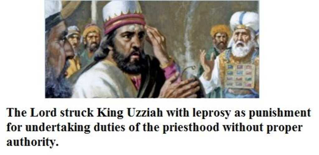 Like his father, Azariah’s (Uzziah’s) pride turned his heart against God. Azariah (Uzziah) observed how pride led to his father’s destruction. God provided Amaziah with a victory over Edom (2 Kgs. 14:7). Out of pride, Amaziah then picked a war with Northern Israel and lost (2 Kgs. 14:8-16). While his father’s pride resulted in a war, Azariah’s (Uzziah’s) pride led to a different type of power grab. He attempted to take total control by merging the separate roles of church and state. He did this by usurping the role of the priests in offerings at the Temple: “But when he became strong, his heart was so proud that he acted corruptly, and he was unfaithful to the Lord his God, for he entered the temple of the Lord to burn incense on the altar of incense. 17 Then Azariah the priest entered after him and with him eighty priests of the Lord, valiant men. 18 They opposed Uzziah the king and said to him, ‘It is not for you, Uzziah, to burn incense to the Lord, but for the priests, the sons of Aaron who are consecrated to burn incense. Get out of the sanctuary, for you have been unfaithful and will have no honor from the Lord God.’ 19 But Uzziah, with a censer in his hand for burning incense, was enraged; and while he was enraged with the priests, the leprosy broke out on his forehead before the priests in the house of the Lord, beside the altar of incense. 20 Azariah the chief priest and all the priests looked at him, and behold, he was leprous on his forehead; and they hurried him out of there, and he himself also hastened to get out because the Lord had smitten him. 21 King Uzziah was a leper to the day of his death; and he lived in a separate house, being a leper, for he was cut off from the house of the Lord. And Jotham, his son, was over the king’s house judging the people of the land.” (2 Chr. 26:16-20).