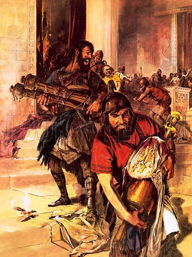 God allows Nebuchadnezzar II to loot the Temple and impoverish the Jews. In addition to seizing the leaders of Judah, Nebuchadnezzar II also looted whatever treasures he could find: “13 He carried out from there all the treasures of the house of the Lord, and the treasures of the king’s house, and cut in pieces all the vessels of gold which Solomon king of Israel had made in the temple of the Lord, just as the Lord had said. 14 Then he led away into exile all Jerusalem and all the captains and all the mighty men of valor, ten thousand captives, and all the craftsmen and the smiths. None remained except the poorest people of the land.” (2 Kgs. 24:13-14). Nebuchadnezzar II took the treasures from the Temple (2 Kgs. 24:13). He left Judah destitute and without its skilled workers.