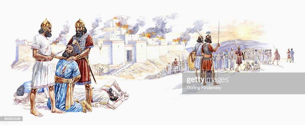 Nebuchadnezzar kills Zedekiah’s sons and blinds Zedekiah. Also as part of God’s judgment, Nebuchadnezzar captured Zedekiah, killed his sons and blinded him: “4 Then the city was broken into, and all the men of war fled by night by way of the gate between the two walls beside the king’s garden, though the Chaldeans were all around the city. And they went by way of the Arabah. 5 But the army of the Chaldeans pursued the king and overtook him in the plains of Jericho and all his army was scattered from him. 6 Then they captured the king and brought him to the king of Babylon at Riblah, and he passed sentence on him. 7 They slaughtered the sons of Zedekiah before his eyes, then put out the eyes of Zedekiah and bound him with bronze fetters and brought him to Babylon.” (2 Kgs. 25:4-7). To breach the defenses of the walled city, the Babylonians built a siege wall made of wood towers. In 586 B.C., during the eleventh year of Zedekiah’s reign, the Babylonians breached the city’s defenses. During a diversion at night, Zedekiah and his men escaped. They fled 20 miles until they were caught in the Jericho plains. The Babylonians then took Zedekiah captive, killed his sons, and blinded him. By killing the royal heirs, Nebuchadnezzar sought to prevent a rebellion from a future king.