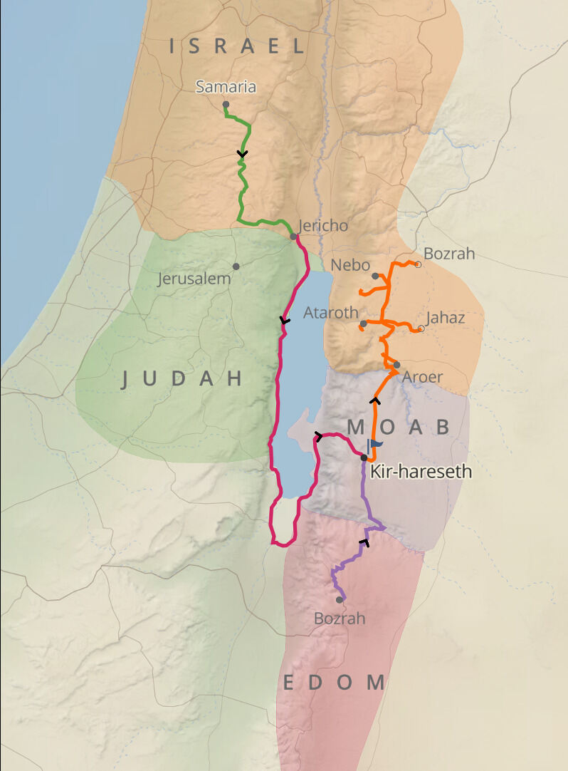 The Moabites rebel against Northern Israel, and the Jews unite against them. Because the Jews were weakened through idolatry, internal conflicts and wars with the Syrians, a vassal king in Moab exploited this chaos by refusing to pay further tribute to Northern Israel: “4 Now Mesha king of Moab was a sheep breeder, and used to pay the king of Israel 100,000 lambs and the wool of 100,000 rams. 5 But when Ahab died, the king of Moab rebelled against the king of Israel. 6 And King Jehoram went out of Samaria at that time and mustered all Israel. 7 Then he went and sent word to Jehoshaphat the king of Judah, saying, ‘The king of Moab has rebelled against me. Will you go with me to fight against Moab?’ And he said, ‘I will go up; I am as you are, my people as your people, my horses as your horses.’ 8 He said, ‘Which way shall we go up?’ And he answered, ‘The way of the wilderness of Edom.’” (2 Kgs. 3:4-8). Mesha was a regent as opposed to a formal king: “Now there was no king in Edom; a deputy was king.” (1 Kgs. 22:47). From sources outside of the Bible, scholars have confirmed this rebellion. A stone monument in Jordan called the “Mesha” Stele or Moabite Stone (circa 840 B.C.) recounts how Mesha responded to the oppression under the house of King Omri, which would have included his heirs Ahab, Ahaziah and Jeroram. Moab was east of the dead sea and was forced to pay yearly tribute to the Jews after King David conquered them (2 Sam. 8:2). Mesha felt that the yearly tribute of lambs and wool was excessive. Because Northern Israel was weakened from constant conflict with the Syrians, Ahab’s death and divisions with Judah, he felt that the time was right to rebel. He first rebelled in 853 B.C. when Ahab’s oldest son Ahaziah became king (2 Kgs. 1:1). After Jehoram became king, he prepared Northern Israel for war. He also asked Jehoshaphat to have the Jews from Judah assist him in the battle (2 Kgs. 3:7). Jehoshaphat previously used almost identical words to form an agreement to fight with Ahab to fight against the Assyrians: “And [Ahab] said to Jehoshaphat, ‘Will you go with me to battle at Ramoth-gilead?’ And Jehoshaphat said to the king of Israel, ‘I am as you are, my people as your people, my horses as your horses.”’ (1 Kgs. 22:4). Yet, God was forced to intervene to save Jehoshaphat’s life after Ahab tried to trick the Assyrians into thinking that Jehoshaphat was the King of Northern Israel (2 Chr. 18:31-32). Jehoshaphat, however, may have overlooked his prior mistake because the Moabites had previously attacked him: “Now it came about after this that the sons of Moab and the sons of Ammon, together with some of the Meunites, came to make war against Jehoshaphat.” (2 Chr. 20:1). Jehoshaphat had also forgotten Ahab’s betrayal when he formed an unholy alliance with Ahab’s son Ahaziah: “35 After this Jehoshaphat king of Judah allied himself with Ahaziah king of Israel. He acted wickedly in so doing.” (2 Chr. 20:35). Thus, Jehoshaphat seemed to have little concern about forming an alliance with a third wicked king from Northern Israel. Jehoram asked Jehoshaphat where to attack because of his greater experience in battle. He proposed attacking through the “wilderness of Edom,” which was on the southern end of the Dead Sea (2 Kgs. 3:8). This desert area was considered the least defended portion of Moab. Yet, it was also dangerous for a traveling army because it lacked water. Edom, which was to the south of Moab, was also a vassal state of Judah and hostile to the Moabites (2 Kgs. 3:9). Yet, not long after this battle, it would also rebel against Judah: “In his days Edom revolted from under the hand of Judah, and made a king over themselves.” (2 Kgs. 8:20).