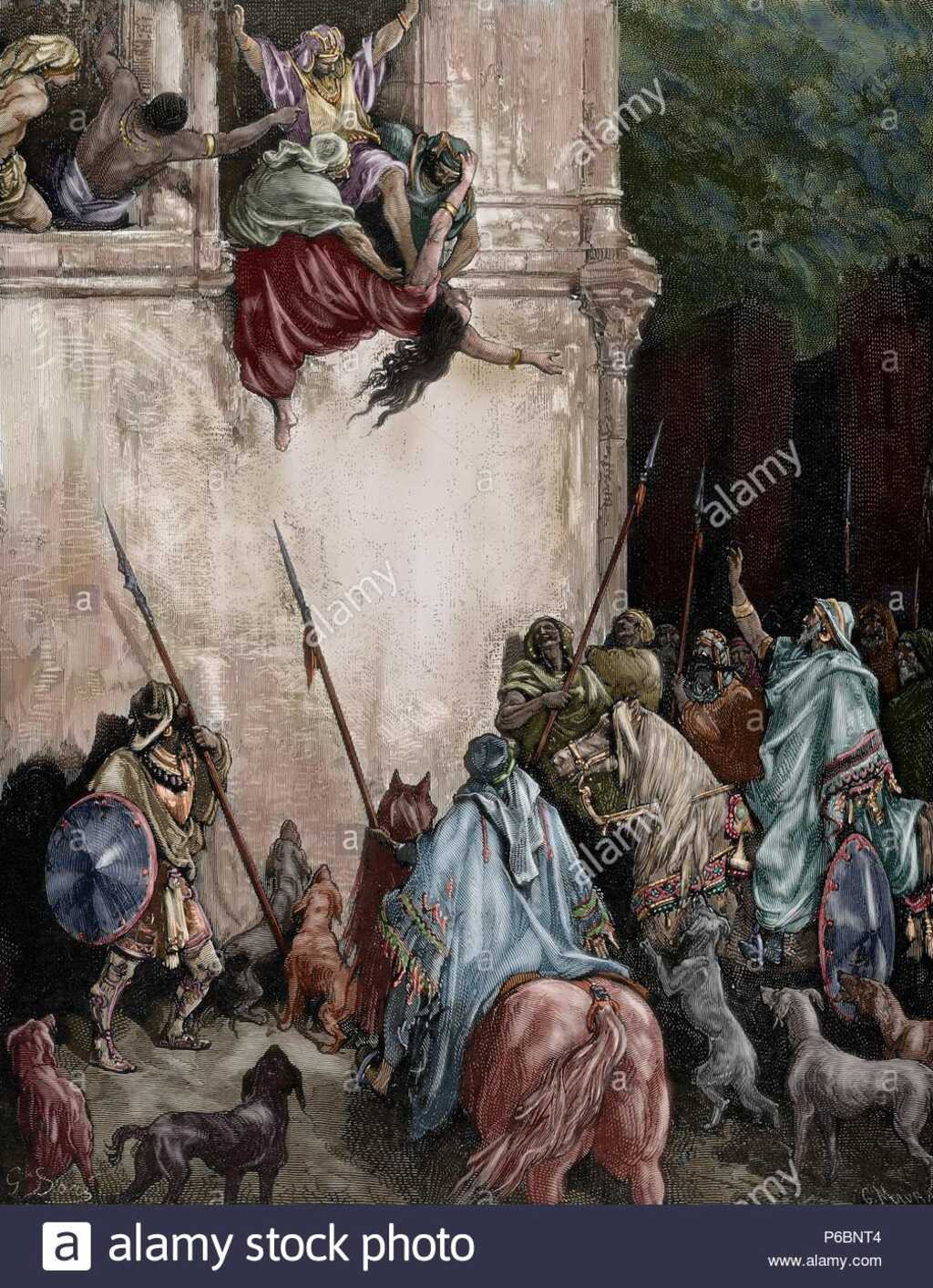 Jehu has Jezebel killed. In her final moments, Jezebel taunted Jehu. Jehu then had her killed and allowed dogs to feed off her rotting corpse: “30 When Jehu came to Jezreel, Jezebel heard of it, and she painted her eyes and adorned her head and looked out the window. 31 As Jehu entered the gate, she said, ‘Is it well, Zimri, your master’s murderer?’ 32 Then he lifted up his face to the window and said, ‘Who is on my side? Who?’ And two or three officials looked down at him. 33 He said, ‘Throw her down.’ So they threw her down, and some of her blood was sprinkled on the wall and on the horses, and he trampled her under foot. 34 When he came in, he ate and drank; and he said, ‘See now to this cursed woman and bury her, for she is a king’s daughter.’ 35 They went to bury her, but they found nothing more of her than the skull and the feet and the palms of her hands. 36 Therefore they returned and told him. And he said, ‘This is the word of the Lord, which He spoke by His servant Elijah the Tishbite, saying, ‘In the property of Jezreel the dogs shall eat the flesh of Jezebel; 37 and the corpse of Jezebel will be as dung on the face of the field in the property of Jezreel, so they cannot say, ‘This is Jezebel.’’’” (2 Kgs. 9:30-37). Out of pride, Jezebel painted her eyes to look like a queen when Jehu arrived for her. Or, some believe that she painted her eyes to show that she would proudly die as the harlot of Baal. She then taunted Jehu by comparing him to the murderous traitor Zimri who ruled for only seven days (1 Kgs. 16:9-10, 15). Jehu then fulfilled a prophecy by having her killed and by allowing dogs to eat her dead body.