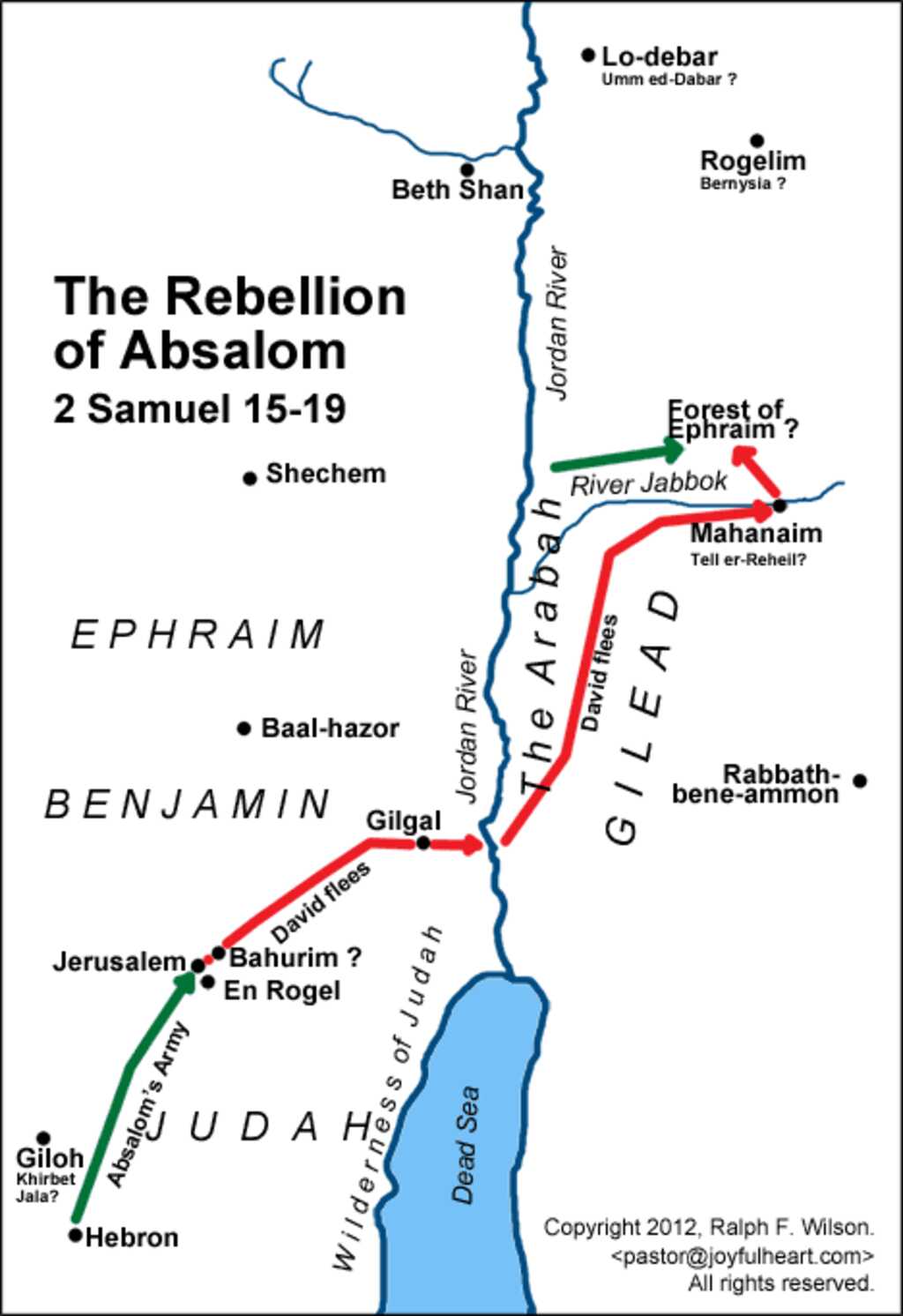 The seven keys to David’s eventual victory. To win the war, David had several things going for him. First, God’s covenant was with David (2 Sam. 7:8-15). As part of this covenant, God promised: “I will give you rest from all your enemies.” (2 Sam. 7:11(b)). Absalom did not stand a chance in trying to defeat God’s covenant with David. Second, David was a man of faith. “A Psalm of David. The LORD is my light and my salvation; whom shall I fear? The LORD is the defense of my life; whom shall I dread?” (Ps. 27:1; 1 Sam. 17:45). “who by faith conquered kingdoms, performed acts of righteousness, obtained promises, shut the mouths of lions,” (Heb. 11:33). Third, David wisely used the time given to him to organize an army. “As Absalom gathered all Israel to him, there would be some delay; and David, like a wise general, made use of it for training the brave but undisciplined men who had joined him, chiefly from Gilead. Besides these, he had with him numerous veterans, whose skill and experience would be invaluable in such service. The result was that when the rebels came to close quarters, they had a vast body of men, but David a disciplined force, which, under skillful generalship, scattered Absalom’s raw levies with ease.” (Pulpit commentary on 2 Sam. 18:1).3 Fourth, David followed the principles of delegation that Moses learned through his father-in-law Jethro by selecting capable leaders (Ex. 18:25; Dt. 1:15). Fifth, David followed Gideon’s example when he divided his army in three companies in order to defeat the far more numerous troops from Midian (Jdgs. 7:16). When Saul walked with God, he also divided his army into three companies in order to encircle and defeat the more numerous Ammonite army (1 Sam. 11:11). David’s plan allowed for Absalom’s troops to be surprised with a strategic attack from three directions. Sixth, David hid his forces in the forests of Ephraim, where Absalom’s larger forces would not be able to fight in a single formation (2 Sam. 18:6). Finally, David also heeded the advice of his commanders to let them lead the fight (2 Sam. 18:3-4). A king would normally lead a fight (2 Sam. 11:1). But his commanders knew that David was emotionally compromised in fighting his son. He would also be a target for the enemy forces seeking to quickly end the fight with a surprise assassination. They also claimed that he could send reservist troops if needed.