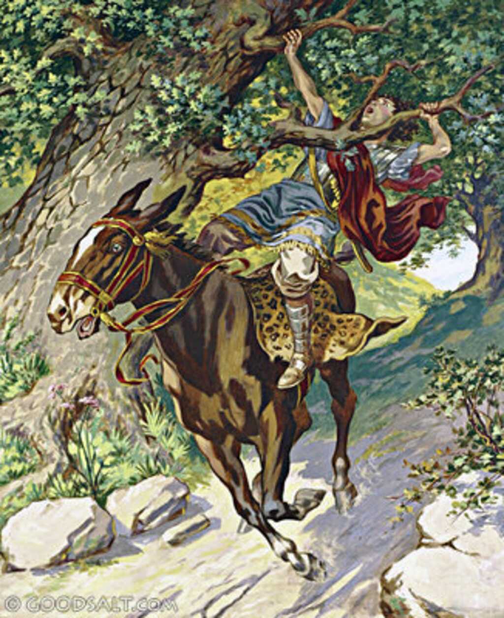 Absalom hung on a tree as part of his curse. Absalom suffered an ignoble end. Instead of a mighty horse, he fled on a donkey and was then caught by his head in the branches: “9 Now Absalom happened to meet the servants of David. For Absalom was riding on his mule, and the mule went under the thick branches of a great oak. And his head caught fast in the oak, so he was left hanging between heaven and earth, while the mule that was under him kept going. 10 When a certain man saw it, he told Joab and said, ‘Behold, I saw Absalom hanging in an oak.’” (2 Sam. 18:9-10). Some commentators state that he hung by his hair, the source of his vanity: “When he cut the hair of his head (and it was at the end of every year that he cut it, for it was heavy on him so he cut it), he weighed the hair of his head at 200 shekels by the king’s weight.” (2 Sam. 14:26). The text does not state this. If he did hang by his hair, his pride led to his downfall. “Pride goes before destruction, and a haughty spirit before stumbling.” (Prov. 16:18). Whatever caused him to get caught, the more important fact is that he was cursed for hanging on a tree.