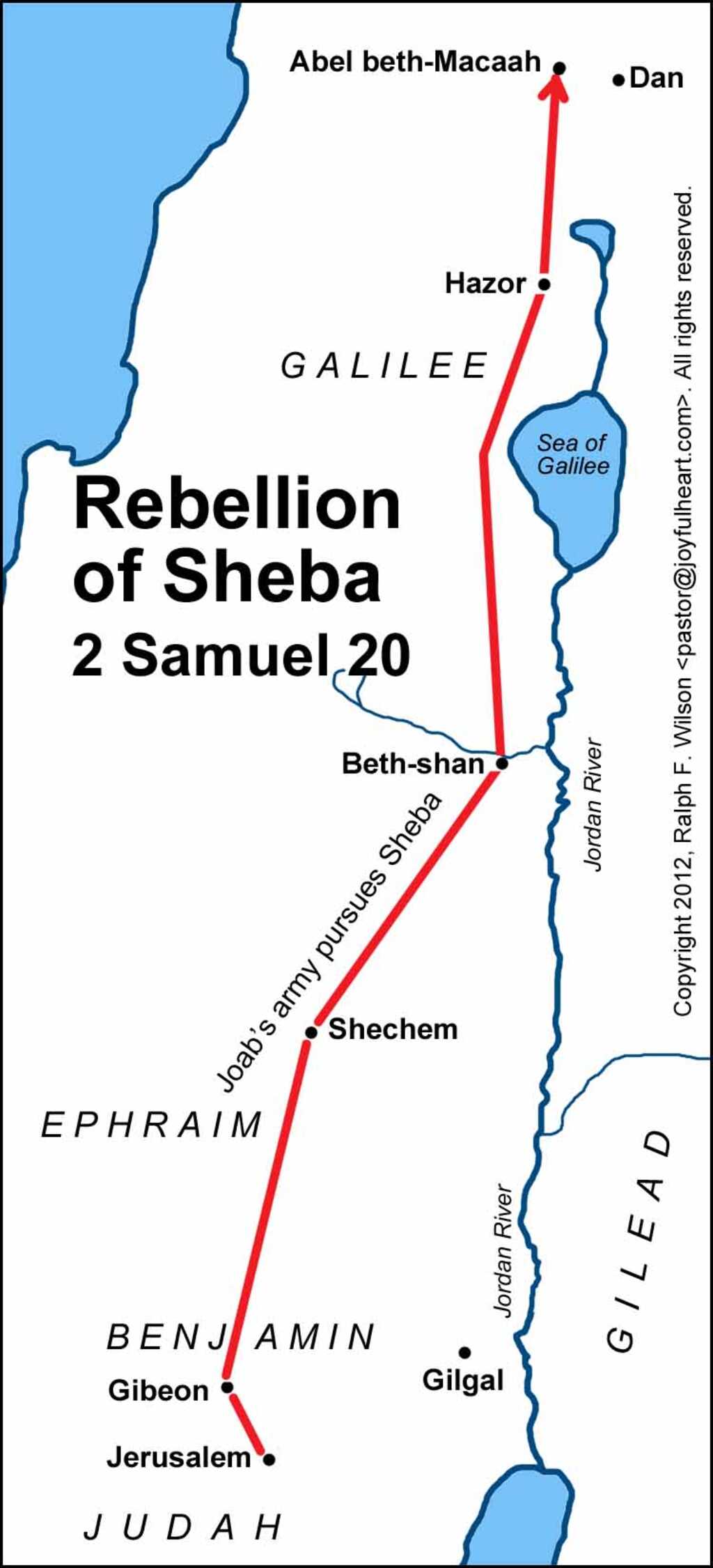 Sheba incites the ten northern tribes into a revolt. The peace following David’s victory over Absalom’s troops did not last long. Before David had even returned to Jerusalem, a Benjamite from Saul’s tribe named Sheba led the ten northern tribes into a new revolt: “1 Now a worthless fellow happened to be there whose name was Sheba, the son of Bichri, a Benjamite; and he blew the trumpet and said, ‘We have no portion in David, nor do we have inheritance in the son of Jesse; every man to his tents, O Israel!” 2 So all the men of Israel withdrew from following David and followed Sheba the son of Bichri; but the men of Judah remained steadfast to their king, from the Jordan even to Jerusalem.” (2 Sam. 20:1-2). Sheba was an opportunist. The tribe of Judah (and Simeon which it had absorbed) returned back with David across the River Jordan without the ten tribes to the north. This caused the ten tribes to feel slighted and less important in David’s kingdom: “But the men of Israel answered the men of Judah and said, ‘We have ten parts in the king, therefore we also have more claim on David than you. Why then did you treat us with contempt? Was it not our advice first to bring back our king?’ Yet the words of the men of Judah were harsher than the words of the men of Israel.” (2 Sam. 19:43). These divisions would persist and eventually lead to the partition of Israel.