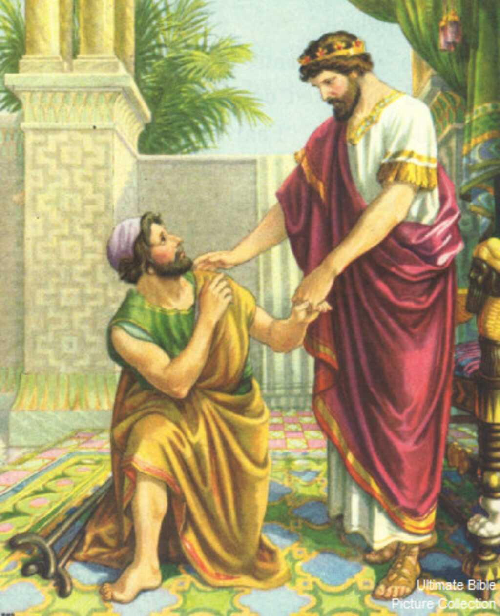 David, the King, seeks to honor his covenant of love. After defeating many of his foreign enemies, David could have turned inward to purge the kingdom of potential rivals to the throne. That is what a normal king would do. But David distinguished himself from Saul and the worldly leaders around him by seeking to show God’s love toward his potential enemies: “1 Then David said, ‘Is there yet anyone left of the house of Saul, that I may show him kindness for Jonathan’s sake?’” (2 Sam. 9:1). Any descendant of Saul’s son Jonathan had a potential claim to the throne. Any such person was therefore a potential enemy who would normally be executed to eliminate any rivalry for the throne. But David previously made a covenant of love with Jonathan: “Jonathan made a covenant with David because he loved him as himself.” (1 Sam. 18:3). As part of this covenant, Jonathan agreed to support David as king, and David agreed not to kill any of Jonathan’s descendants: ‘“15 You shall not cut off your lovingkindness from my house forever, not even when the LORD cuts off every one of the enemies of David from the face of the earth.”’ 16 So Jonathan made a covenant with the house of David, saying, ‘May the LORD require it at the hands of David’s enemies.’ 17 Jonathan made David vow again because of his love for him, because he loved him as he loved his own life.” (1 Sam. 20:15-17). David’s agape love for Jonathan foreshadowed Jesus’ love for us.