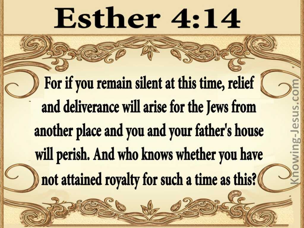 Mordecai’s faith in God to intervene for the Jews, even if Esther were to refuse to help. Mordecai then rebuked Esther for her selfishness. At his moment of transformation when all seemed lost, he responded in faith that God would provide a way to save the Jews: “13 Then Mordecai told them to reply to Esther, ‘Do not imagine that you in the king’s palace can escape any more than all the other Jews. 14 For if you keep silent at this time, liberation and rescue will arise for the Jews from another place, and you and your father’s house will perish.” (Esther 4:13-14a). Mordecai warned that Esther’s secret identity would not remain a secret for long. If she said nothing, she would eventually be exposed. Even though Mordecai wanted Esther to act, he put his faith in God, not her. Facing certain death, he now firmly trusted in God to keep His promises to His people.