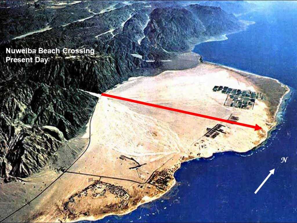 The only suitable underwater land bridge exists at Nuweiba Beach. Nuweiba beach is also the only place where an underwater land bridge rises from the seafloor to allow for a possible crossing by land from Egypt into Saudi Arabia. On both sides of the plateau, the water drops to 3,000 and 5,000 feet respectively. Not by coincidence, “Nuweiba” is short for the Arabic phrase “Nuwayba’ al Muzayyinah.” This translates as “Waters of Moses’ Opening.” (source Wikipedia).