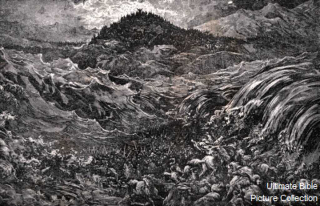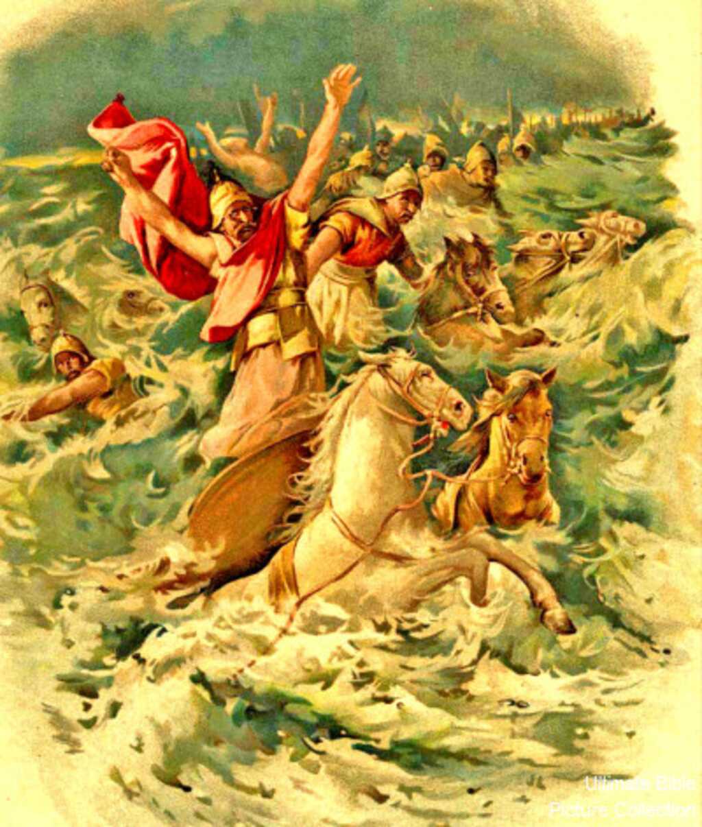 God destroys Pharaoh’s army in the sea. After the Jews had safely passed through the sea, God allowed the Egyptians to enter the same passageway. Yet, as the faith of those passing through disappeared, the walls first weakened and water began to seep into the ground. This trapped the Egyptian chariot wheels in the mud. The Egyptians’ lack of faith then caused the weakened sea walls to crumble down and crush them: “23 Then the Egyptians took up the pursuit, and all Pharaoh’s horses, his chariots and his horsemen went in after them into the midst of the sea. 24 At the morning watch, the Lord looked down on the army of the Egyptians through the pillar of fire and cloud and brought the army of the Egyptians into confusion. 25 He caused their chariot wheels to swerve, and He made them drive with difficulty; so the Egyptians said, ‘Let us flee from Israel, for the Lord is fighting for them against the Egyptians.’ 26 Then the Lord said to Moses, ‘Stretch out your hand over the sea so that the waters may come back over the Egyptians, over their chariots and their horsemen.’ 27 So Moses stretched out his hand over the sea, and the sea returned to its normal state at daybreak, while the Egyptians were fleeing right into it; then the Lord overthrew the Egyptians in the midst of the sea. 28 The waters returned and covered the chariots and the horsemen, even Pharaoh’s entire army that had gone into the sea after them; not even one of them remained. 29 But the sons of Israel walked on dry land through the midst of the sea, and the waters were like a wall to them on their right hand and on their left.” (Ex. 14:23-29). Pharaoh’s defeat is retold throughout the Bible: “and what He did to Egypt’s army, to its horses and its chariots, when He made the water of the Red Sea to engulf them while they were pursuing you, and the LORD completely destroyed them;” (Dt. 11:4; Ex. 15:19). ‘“I brought your fathers out of Egypt, and you came to the sea; and Egypt pursued your fathers with chariots and horsemen to the Red Sea.’ But when they cried out to the LORD, He put darkness between you and the Egyptians, and brought the sea upon them and covered them; and your own eyes saw what I did in Egypt.” (Josh. 24:6-7(a)). “He led them safely, so that they did not fear; but the sea engulfed their enemies.” (Ps. 78:53). “The waters covered their adversaries; not one of them was left.” (Ps. 106:11). “But He overthrew Pharaoh and his army in the Red Sea, for His lovingkindness is everlasting.” (Ps. 136:15). “You divided the sea before them, so they passed through the midst of the sea on dry ground; and their pursuers You hurled into the depths, like a stone into raging waters.” (Neh. 9:11). Are you sharing with others what God has freed you from?