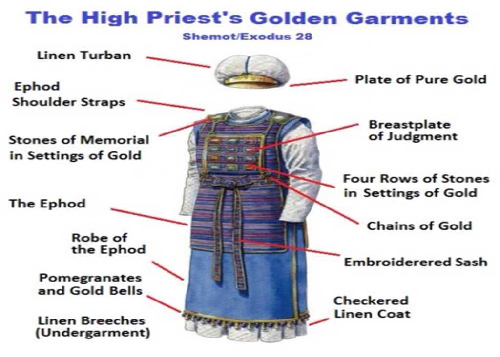 The clothing of the high priest. After selecting Aaron’s family to serve as priests, God then instructed Moses to prepare the clothing for the high priest: “4 These are the garments which they shall make: a breastpiece and an ephod and a robe and a tunic of checkered work, a turban and a sash, and they shall make holy garments for Aaron your brother and his sons, that he may minister as priest to Me. 5 They shall take the gold and the blue and the purple and the scarlet material and the fine linen. 6 They shall also make the ephod of gold, of blue and purple and scarlet material and fine twisted linen, the work of the skillful workman.” (Ex. 28:4-6). Each of these things pointed to Jesus and what He does for us.