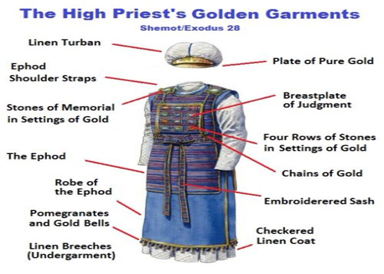 The clothing of the high priest. The Jews began by preparing the clothing for the high priest: “1 Moreover, from the blue and purple and scarlet material, they made finely woven garments for ministering in the holy place as well as the holy garments which were for Aaron, just as the Lord had commanded Moses. 2 He made the ephod of gold, and of blue and purple and scarlet material, and fine twisted linen. 3 Then they hammered out gold sheets and cut them into threads to be woven in with the blue and the purple and the scarlet material, and the fine linen, the work of a skillful workman. 4 They made attaching shoulder pieces for the ephod; it was attached at its two upper ends. 5 The skillfully woven band which was on it was like its workmanship, of the same material: of gold and of blue and purple and scarlet material, and fine twisted linen, just as the Lord had commanded Moses.” (Ex. 39:1-5). The materials that the Jews created followed God’s instructions to Moses (Ex. 28:4-6). Each of these things pointed to Jesus and what He does for us.