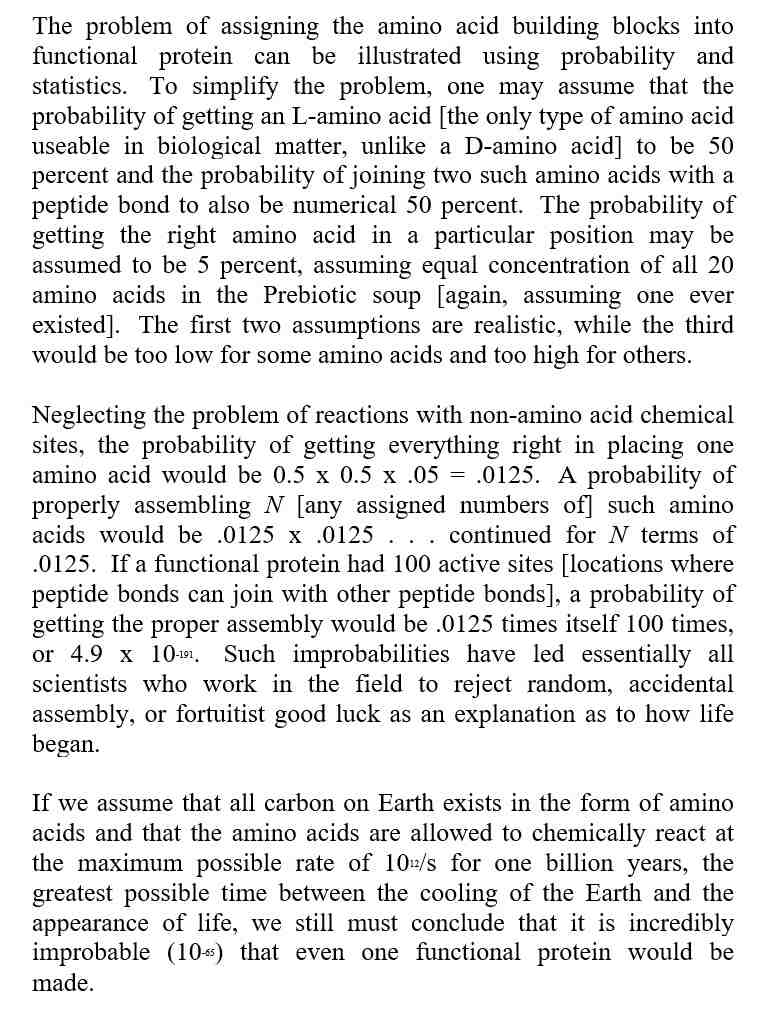 These long statistical odds for the formation of even the most primitive cell can be broken down into the following steps. First, as discussed above, ideal atmospheric and surface conditions must exist for the formation of amino acids. Second, even if long periods of time existed for creation to take place together with favorable environmental conditions, the amino acids must still be properly sequenced in a specific order to create proteins. This proper sequencing can be analogized to the ordering of letters in a sentence to form words. An improper order or the wrong kind of amino acid will prohibit the formation of proteins. Third, even if proteins can be formed under these conditions, these proteins must also be sequenced in complex arrangements to form RNA, like the words forming a sentence. The RNA must also be sequenced in highly complex ways with other chemicals to form the basic building block of life - DNA, like sentences forming a meaningful message.