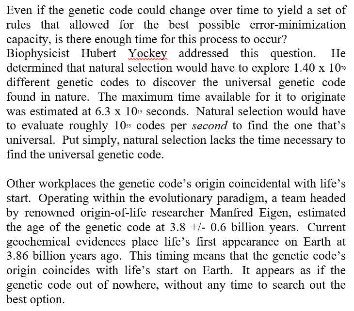 Dr. Fazale Rana, The Cell’s Design, p. 176, citing, Hubert P. Yockey, Information Theory and Molecular Biology (Cambridge: Cambridge University Press, 1992), p. 180-83; Manfred Eigen et al., “How Old is the Genetic Code? Stastical Geometry of the tRNA Provides an Answer,” Science 244 (May 12, 1989), p. 673-79; Rana and Ross, “An Early or Late Appearance?” in Origins of Life: Biblical and Evolutionary Models Face Off (NavPress 2004) p. 63-79.↩︎