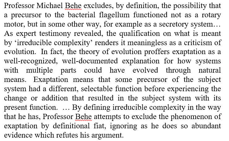 Kitzmiller v. Dover Area Sch. Dist., 400 F. Supp. 2d 379 (M.D. Pa. 2005). In both Darwin's Black Box and as subsequently modified in his 2001 article entitled “Reply to My Critics,” Behe argued that a biological system is irreducibly complex if it: “is composed of several well-matched, interacting parts that contribute to the basic function, wherein the removal of any one of the parts causes the system to effectively cease functioning. An irreducibly complex system cannot be produced directly by slight, successive modifications of a precursor system, because any precursor to an irreducibly complex system that is missing a part is by definition nonfunctional ... Since natural selection can only choose systems that are already working, then if a biological system cannot be produced gradually it would have to arise as an integrated unit, in one fell swoop, for natural selection to have anything to act on.” Id.↩︎