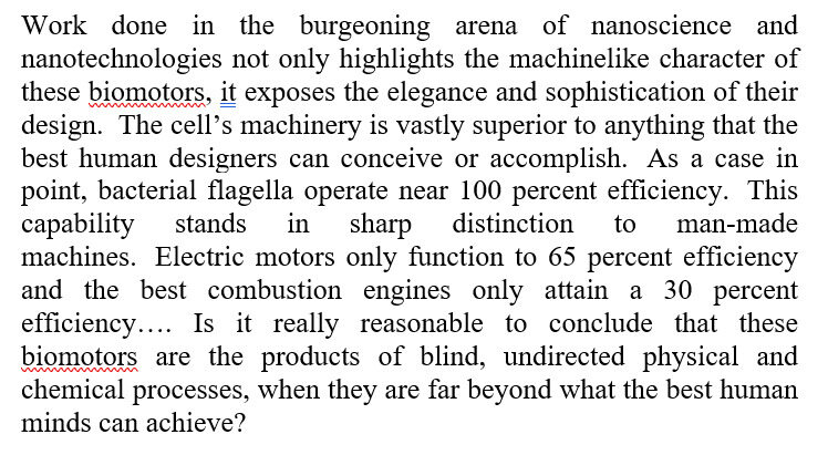 Dr. Fazale Rana, The Cell’s Design (Baker Books 2008), p. 96, citing, Kazuhiko Kinosita Jr., “A Rotary Molecular Motor That Can Work at Near 100% Efficiency,” Philosophical Transactions of the Royal Society B 355 (April 29, 2000) p. 473-89.↩︎