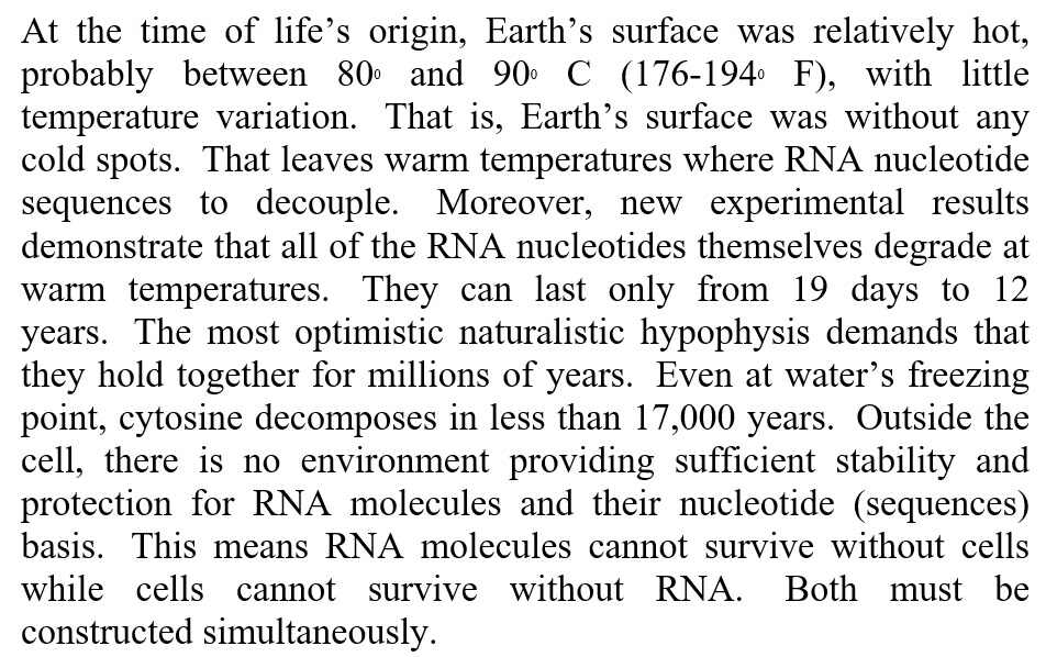 Adding to the problems identified by Meyer, Ross notes that the various nucleotide sequences essential for building RNA and DNA molecules require radically different environmental conditions for their assembly. Cytosine and uracil require near boiling temperatures for their assembly. By contrast, adenine and guanine require near freezing temperatures for assembly.41 Thus, Ross concludes it would be impossible under natural conditions for all four building blocks to assemble themselves together in adequate concentrations at the same location.42