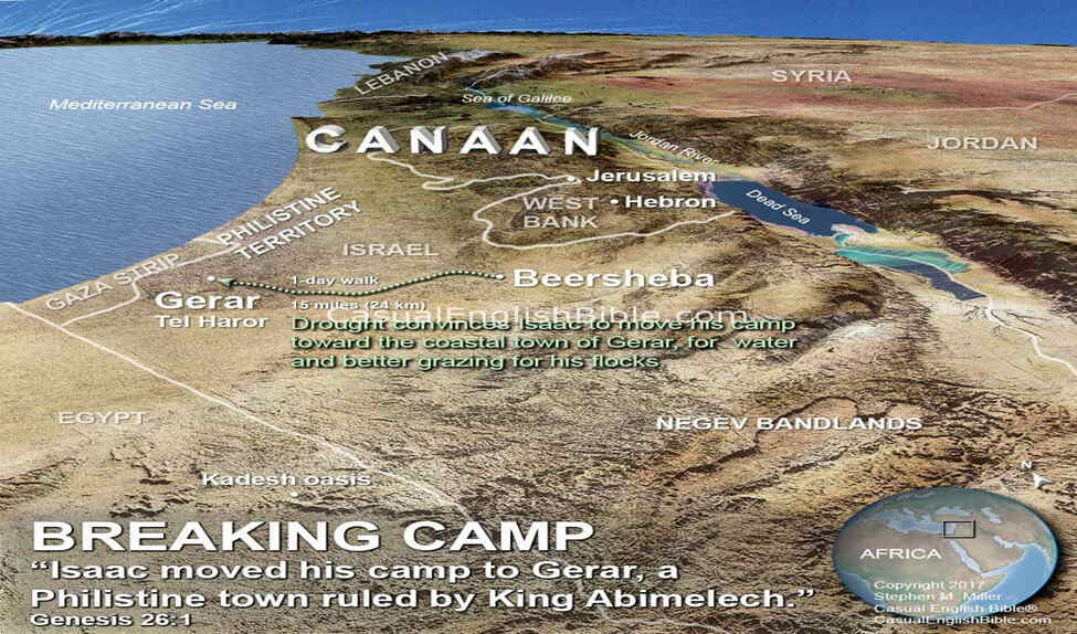 Isaac’s gratitude for God’s blessings. Like Abraham, Isaac’s growing faith caused him to see God’s grace in his undeserved blessings. Thus, he built an altar of sacrifice, repentance, and gratitude after God responded to Isaac’s sins with encouragement and by reconfirming his blessings: “23 Then he went up from there to Beersheba. 24 The Lord appeared to him the same night and said, ‘I am the God of your father Abraham; do not fear, for I am with you. I will bless you, and multiply your descendants, for the sake of My servant Abraham.’ 25 So he built an altar there and called upon the name of the Lord, and pitched his tent there; and there Isaac’s servants dug a well.” (Gen. 26:23-25). Abraham also dug his well and formed his covenant of peace in Beersheba (Gen. 21:30-33). The Jews later referred to the Promised Land by the phrase from “Dan to Beersheba”, a distance of about 144 miles (Judg. 20:1; 1 Chr. 21:2; 2 Sam. 24:2). Here, God repeated the blessings of countless descendants on Isaac. Isaac’s response and his gratitude provides an example to all.