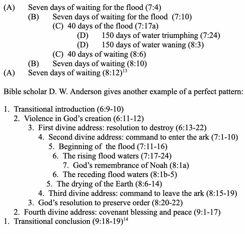 Third, like the creation account, the repetition of certain phrases across in the Flood account form perfect literary patterns that would not be possible if the account were merged together from multiple authors. Bible scholar G. Wenham gives the following example: