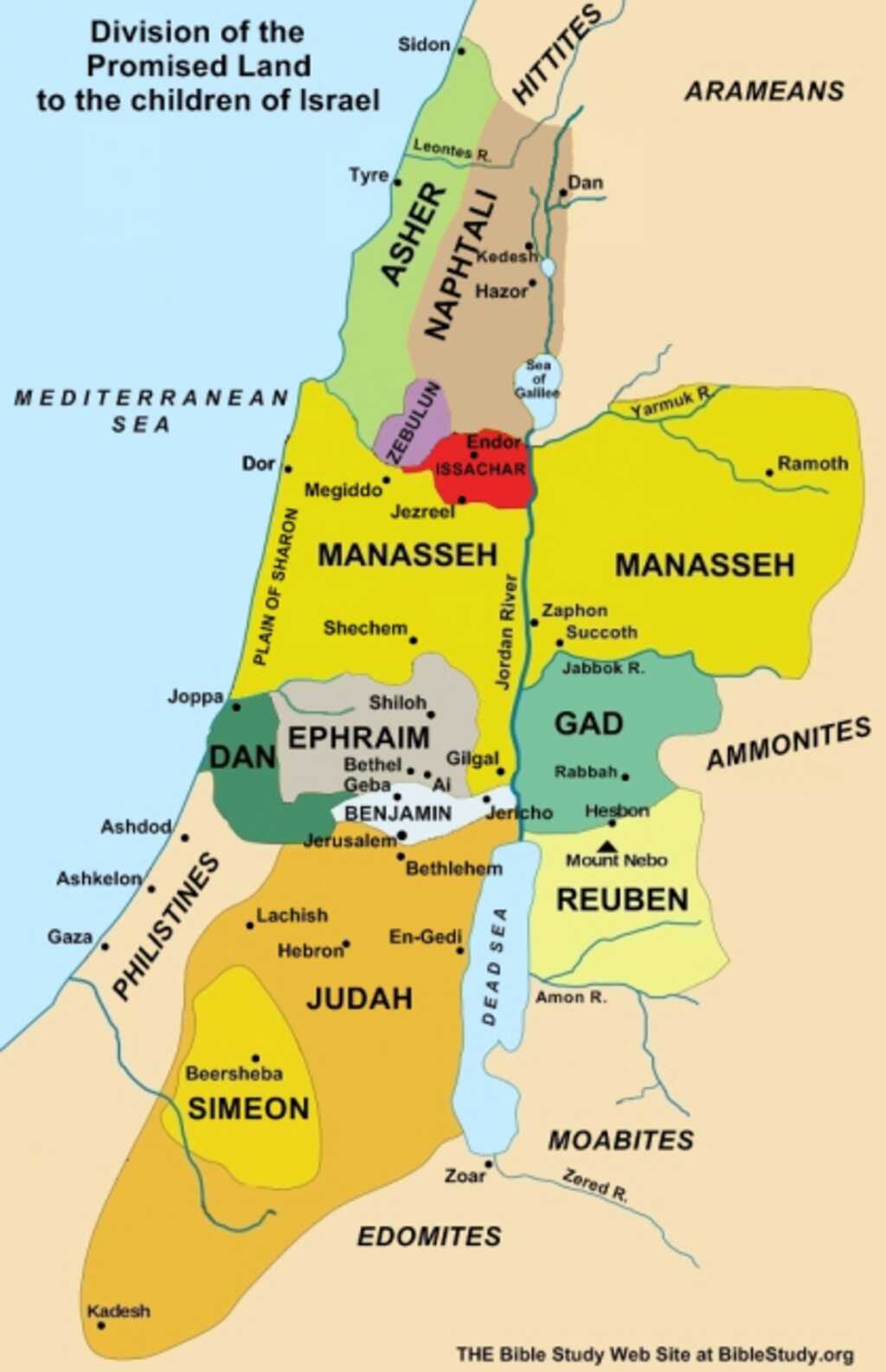 The allotment of land for each family within the tribe of Judah. After describing Caleb’s allotment, God meticulously described the allotment for all the other members of the tribe of Judah: “20 This is the inheritance of the tribe of the sons of Judah according to their families. 21 Now the cities at the extremity of the tribe of the sons of Judah toward the border of Edom in the south were Kabzeel and Eder and Jagur, 22 and Kinah and Dimonah and Adadah, 23 and Kedesh and Hazor and Ithnan, 24 Ziph and Telem and Bealoth, 25 and Hazor-hadattah and Kerioth-hezron (that is, Hazor), 26 Amam and Shema and Moladah, 27 and Hazar-gaddah and Heshmon and Beth-pelet, 28 and Hazar-shual and Beersheba and Biziothiah, 29 Baalah and Iim and Ezem, 30 and Eltolad and Chesil and Hormah, 31 and Ziklag and Madmannah and Sansannah, 32 and Lebaoth and Shilhim and Ain and Rimmon; in all, twenty-nine cities with their villages. 33 In the lowland: Eshtaol and Zorah and Ashnah, 34 and Zanoah and En-gannim, Tappuah and Enam, 35 Jarmuth and Adullam, Socoh and Azekah, 36 and Shaaraim and Adithaim and Gederah and Gederothaim; fourteen cities with their villages. 37 Zenan and Hadashah and Migdal-gad, 38 and Dilean and Mizpeh and Joktheel, 39 Lachish and Bozkath and Eglon, 40 and Cabbon and Lahmas and Chitlish, 41 and Gederoth, Beth-dagon and Naamah and Makkedah; sixteen cities with their villages. 42 Libnah and Ether and Ashan, 43 and Iphtah and Ashnah and Nezib, 44 and Keilah and Achzib and Mareshah; nine cities with their villages. 45 Ekron, with its towns and its villages; 46 from Ekron even to the sea, all that were by the side of Ashdod, with their villages. 47 Ashdod, its towns and its villages; Gaza, its towns and its villages; as far as the brook of Egypt and the Great Sea, even its coastline. 48 In the hill country: Shamir and Jattir and Socoh, 49 and Dannah and Kiriath-sannah (that is, Debir), 50 and Anab and Eshtemoh and Anim, 51 and Goshen and Holon and Giloh; eleven cities with their villages. 52 Arab and Dumah and Eshan, 53 and Janum and Beth-tappuah and Aphekah, 54 and Humtah and Kiriath-arba (that is, Hebron), and Zior; nine cities with their villages. 55 Maon, Carmel and Ziph and Juttah, 56 and Jezreel and Jokdeam and Zanoah, 57 Kain, Gibeah and Timnah; ten cities with their villages. 58 Halhul, Beth-zur and Gedor, 59 and Maarath and Beth-anoth and Eltekon; six cities with their villages. 60 Kiriath-baal (that is, Kiriath-jearim), and Rabbah; two cities with their villages. 61 In the wilderness: Beth-arabah, Middin and Secacah, 62 and Nibshan and the City of Salt and Engedi; six cities with their villages.” (Josh. 15:20-62). These places all existed. But most have different names today. The priests and the elders all played a role in dividing up the land to ensure that no member of Judah was left behind: “It is supposed that the family divisions were not determined by lot. These were left to the prudence and judgment of Joshua, Eleazar, and the ten princes, who appointed to each family a district in proportion to its number, etc., the general division being that alone which was determined by the lot.” (Adam Clarke on Joshua 15).6
