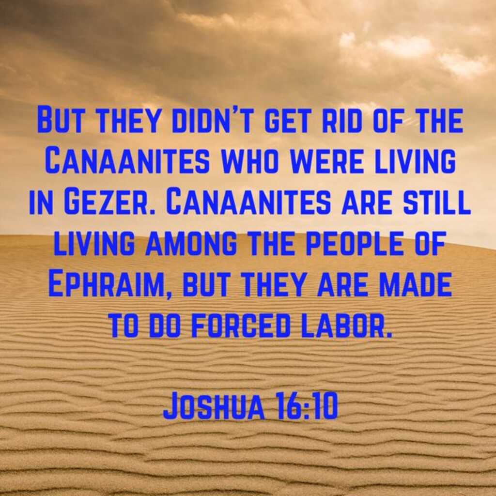 The failure of the Jews to drive out the Canaanites in Gezer. Finally, after listing the blessings for these tribes, God warned the tribe of Ephraim to drive out the Canaanites who lived in the city of Gezer: “10 But they did not drive out the Canaanites who lived in Gezer, so the Canaanites live in the midst of Ephraim to this day, and they became forced laborers.” (Josh. 16:10). Joshua had already defeated the people of Gezer (Josh. 10:33). But the tribe of Ephraim refused to drive out the people of Gezer. Thus, the city remained semi-independent (cf. Jdgs. 1:29). The city was located in the southwestern portion of the territory of Ephraim, approximately 18 miles from Jerusalem. The tribe of Ephraim later made the Canaanites slaves to serve their needs. In so doing, they ignored God’s Law that they not make peace with these people (e.g., Ex. 23:32; Dt. 7:2; 19:13). As one commentator explains: “The Israelites did not fully conquer for two reasons. First, they wanted peace at any cost. Second, they wanted wealth. For the sake of ease and money, they disobeyed God and fell short of what He had for them - as we do today also.” (David Guzik on Joshua chapter 16).3 As a result of the Jews’ refusal to follow God’s warning, the Canaanites grew in size and later threatened the Jews. The Jews would later be forced to fight wars and suffer from spiritual corruption. The lesson is that if you ignore the sins of the flesh, they will grow into a large problem. You must also always follow God’s Law, even when it seems expedient in the short term to ignore it. If you make no provision for the flesh, God will bless you with the peace that surpasses all understanding (Phil. 4:7). Are you compromising God’s law in any area of your walk because you believe that it will help you get ahead in the short term?