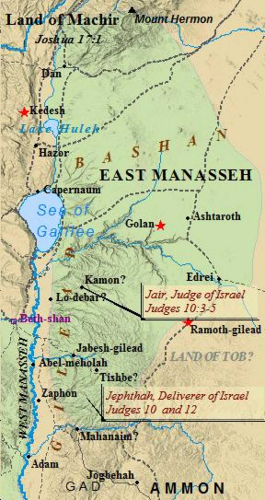 The inheritance for Machir from the tribe of Manasseh. After describing in detail the inheritance of the tribe of Ephraim, Joshua revealed the inheritance for the half of the tribe of Manasseh, which elected to live within the Promised Land. Yet, before listing the boundaries for this half of the Manasseh tribe, he listed the special inheritance for the descendants of Manasseh’s firstborn son Machir: “1 Now this was the lot for the tribe of Manasseh, for he was the firstborn of Joseph. To Machir the firstborn of Manasseh, the father of Gilead, were allotted Gilead and Bashan, because he was a man of war. 2 So the lot was made for the rest of the sons of Manasseh according to their families: for the sons of Abiezer and for the sons of Helek and for the sons of Asriel and for the sons of Shechem and for the sons of Hepher and for the sons of Shemida; these were the male descendants of Manasseh the son of Joseph according to their families.” (Josh. 17:1-2). As Joseph’s firstborn son, Manasseh symbolized the joy that a child can bring a parent in times of trouble: “Joseph named the firstborn Manasseh, ‘For,’ he said, ‘God has made me forget all my trouble and all my father's household.’” (Gen. 41:51). Manasseh’s only son was Machir, and Machir’s firstborn was named Gilead. The descendants of Manasseh’s firstborn grandson became known as the Gileadites: “The sons of Manasseh: of Machir, the family of the Machirites; and Machir became the father of Gilead: of Gilead, the family of the Gileadites.” (Nu. 26:29). Assuming Machir lived a normal life span, he would have died during the first half of the 400-year captivity. Thus, when Joshua spoke of Machir as “a man of war” he was speaking of Machir’s descendants (Josh. 17:1). Joshua was not commending Machir’s descendants for being bloodthirsty. Instead, he was rewarded for them for their faith for fighting for what God had offered.