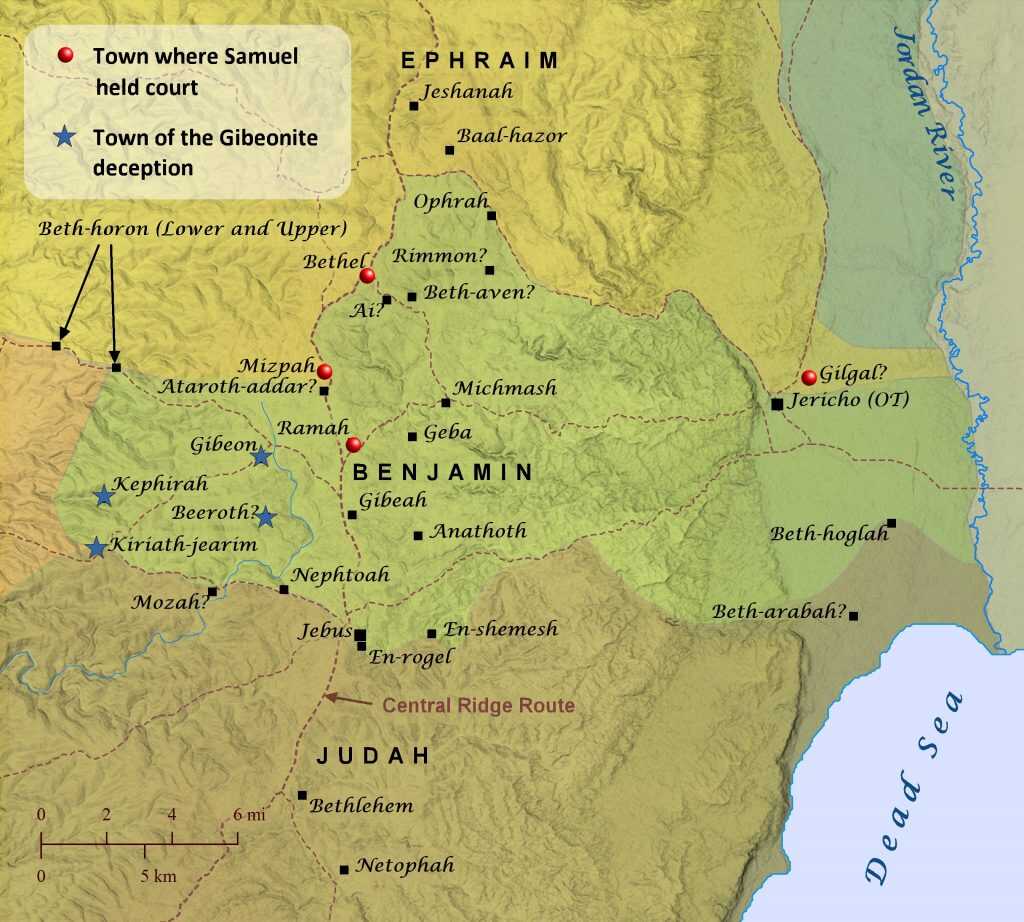 The territory granted to the descendants of the tribe of Benjamin. The first of the seven remaining tribes to receive its allotment was the tribe of Benjamin: “11 Now the lot of the tribe of the sons of Benjamin came up according to their families, and the territory of their lot lay between the sons of Judah and the sons of Joseph. 12 Their border on the north side was from the Jordan, then the border went up to the side of Jericho on the north, and went up through the hill country westward, and it ended at the wilderness of Beth-aven. 13 From there the border continued to Luz, to the side of Luz (that is, Bethel) southward; and the border went down to Ataroth-addar, near the hill which lies on the south of lower Beth-horon. 14 The border extended from there and turned round on the west side southward, from the hill which lies before Beth-horon southward; and it ended at Kiriath-baal (that is, Kiriath-jearim), a city of the sons of Judah. This was the west side. 15 Then the south side was from the edge of Kiriath-jearim, and the border went westward and went to the fountain of the waters of Nephtoah. 16 The border went down to the edge of the hill which is in the valley of Ben-hinnom, which is in the valley of Rephaim northward; and it went down to the valley of Hinnom, to the slope of the Jebusite southward, and went down to En-rogel. 17 It extended northward and went to En-shemesh and went to Geliloth, which is opposite the ascent of Adummim, and it went down to the stone of Bohan the son of Reuben. 18 It continued to the side in front of the Arabah northward and went down to the Arabah. 19 The border continued to the side of Beth-hoglah northward; and the border ended at the north bay of the Salt Sea, at the south end of the Jordan. This was the south border. 20 Moreover, the Jordan was its border on the east side. This was the inheritance of the sons of Benjamin, according to their families and according to its borders all around.” (Josh. 18:11-20). The lot of Benjamin was immediately north of the tribe of Judah and south of the allotments given to the two tribes of Joseph, Ephraim and Manasseh (Marten Woudrstra, The New International Commentary on the Old Testament, the Book of Joshua (William Eerdmans Publishing Co. 1981) p. 276). Its territory on the south also touched the north side of the “Salt Sea,” which is known today as the Dead Sea (Josh. 18:19). Benjamin was the second and the last son of Rachel. His tribe was also the last of the 12 tribes (Gen. 35:24). Through Benjamin’s example in the wilderness, God showed that believers can grow in their walk, even when they journey in the desert. While in the wilderness, Benjamin’s tribe grew from 35,400 to 45,600 fighting men (Nu. 1:37; 26:41). In 38 years, this was an increase of 10,200 or 28.81%. The amount of territory that it received increased based upon its increased size from its obedience.