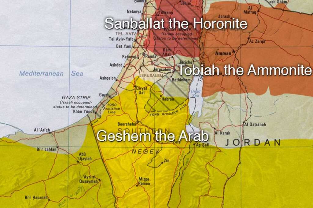 The Jews’ enemies conspired to attack them when their insults failed to stop them. Because God’s Spirit had strengthened the Jews in the face of the enemy’s insults, Sanballat and Tobiah formed a conspiracy with various pagan peoples to attack the Jews: “7 Now when Sanballat, Tobiah, the Arabs, the Ammonites, and the Ashdodites heard that the repair of the walls of Jerusalem went on, and that the breaches began to be closed, they were very angry. 8 So all of them conspired together to come to fight against Jerusalem and to cause confusion in it.” (Neh. 4:7-8). The Jews were surrounded with enemies. The Arabs were to their south, the Ammonites were to their east, the Samaritans to their north, and the Ashdodites (descendants from the Philistines) were to their west. Even if Sanballat and Tobiah could not launch an actual attack, they still hoped their coalition would create “confusion” amongst the Jews (Neh. 7:8). The Jews’ progress in closing the breaches in the walls motivated the enemy to act before it was too late. Even though the Jews had Persian approval to rebuild, the enemy calculated that they could make up lies about the Jews if they could act quickly to destroy them.