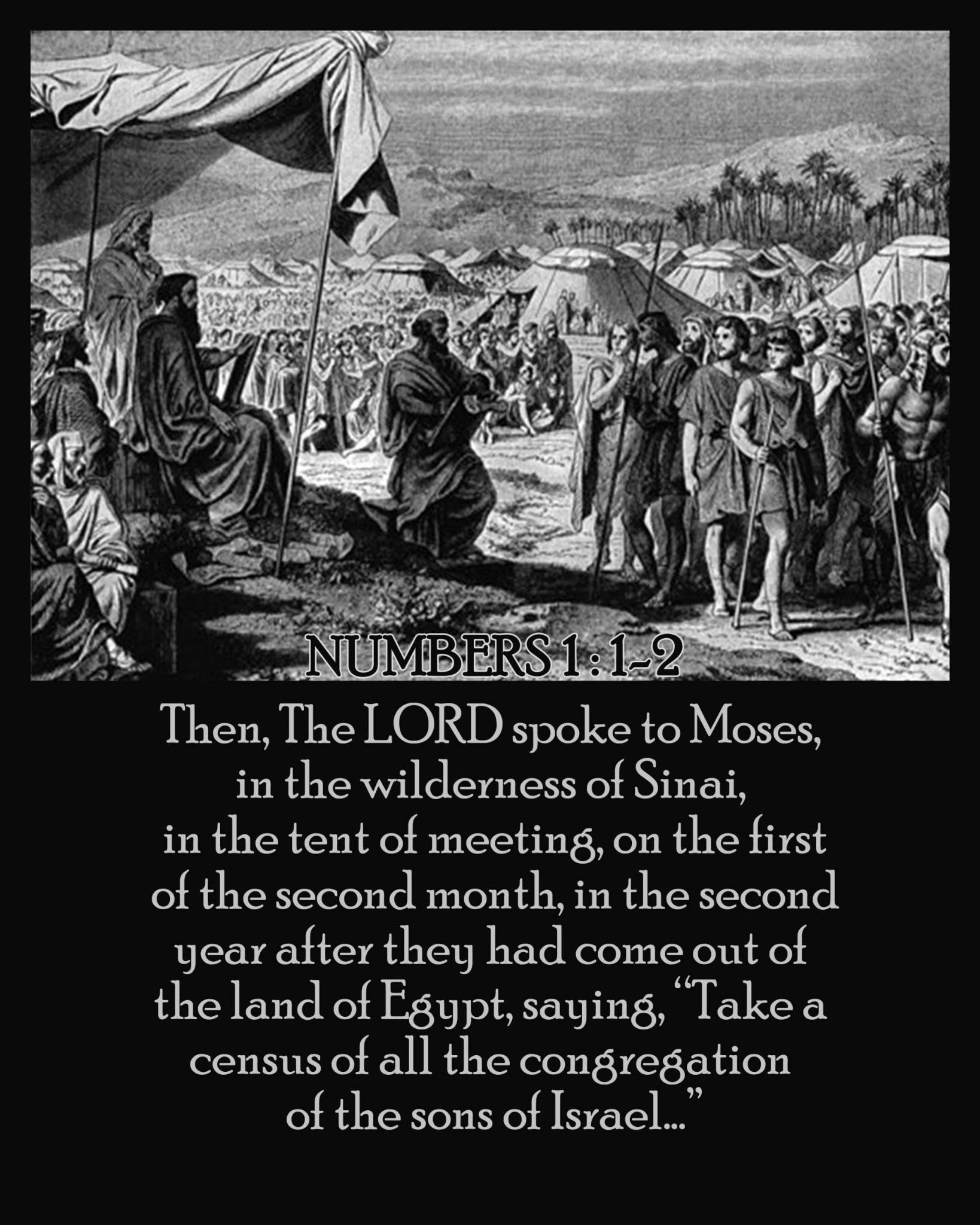 Numbers 1:2-4. “2 Take a census of all the congregation of the sons of Israel, by their families, by their fathers’ households, according to the number of names, every male, head by head 3 from twenty years old and upward, whoever is able to go to war in Israel. You and Aaron shall count them by their armies. 4 With you, moreover, there shall be a man of each tribe, each one head of his father’s household.” (Nu. 1:2-4).