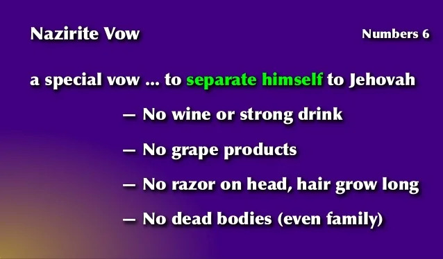 The Nazarite vow of abstinence. To become a Nazarite, the person had to vow to give up alcohol: “3 he shall abstain from wine and strong drink; he shall consume no vinegar, whether made from wine or strong drink, nor shall he drink any grape juice nor eat fresh or dried grapes. 4 All the days of his consecration he shall not eat anything that is produced from the grape vine, from the seeds even to the skin.” (Nu. 6:3-4). This one of the many vows that Sampson would later break.