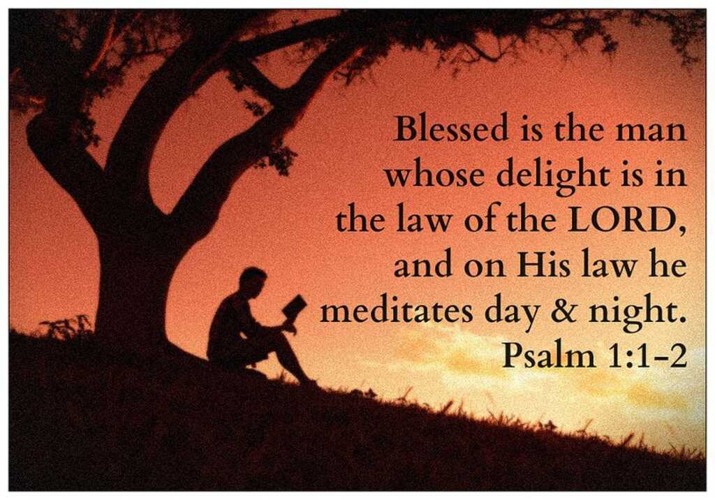 Meditate on God’s Word, including the Law. The psalmist’s urging to “meditate” (Ps. 1:2) carries great practical instruction: “The righteous man ponders the word of God. He does not just hear it and forget it; he thinks about it. Christians should meditate on God’s word! In eastern meditation, the goal is to empty the mind. This is dangerous, because an empty mind may present an open invitation to deception or a demonic spirit. But in Christian meditation, the goal is to fill your mind with the word of God. This can be done by carefully thinking about each word and phrase, applying it to one’s self, and praying it back to the Lord. . . Many lack because they only read and do not meditate. . . . The righteous man only has God’s word on his mind two times a day: day and night. That about covers it all!” (David Guzik on Psalms 1) (italics in original).4