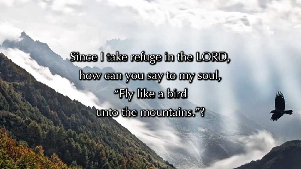 Be watchful for ungodly advice from people of faith. Like David’s friends, the Bible is filled with examples of people of faith offering ungodly advice. As one commentator observes: “The advice given to David is well meant, but ungodly. It is like when Peter advised Jesus to not go the way of the cross (Matthew 16:22-23). Peter meant well, but he was really being used by the devil! We must always be careful with the advice we give to others. First, we must always mind our own business and not be busybodies (1 Thessalonians 4:11, 1 Timothy 5:13). Second, we can be too confident in our own perception of a situation. Job’s friend confidently said ‘I will tell you, hear me; what I have seen I will declare’ (Job 15:17), but he was wrong . . . here, David’s friends are trying to make him afraid of a secret attack. When we fear the things we can’t see, we are really walking in fear! David’s friends may have been using an element of manipulation here. They may have reasoned like this: ‘Look, for his own good we have to get David to get out of here. It’s justified for us to exaggerate things a little bit to get him to do what is right.’ But it wasn't justified. Manipulation is never right, even if it is for a good cause.” (David Guzik on Ps. 11).2