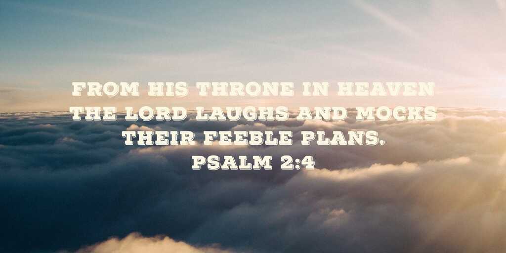 Mankind’s rebellion against God is futile. Although mankind may try to replace God’s morality with its own, its efforts are doomed to fail: “4 He who sits in the heavens laughs, the Lord scoffs at them.” (Ps. 2:4). Some might be troubled to think of God laughing at sinners. “But is this a heartless or cruel laughter? No! His infinite greatness that mocks man’s defiance also marks His sympathy with man in his lost condition. He’s the same God who takes no pleasure in the death of the wicked (Ezekiel 33:11) and who wept over Jerusalem (Matthew 23:37-39). He is great in judgment but also in compassion (Exodus 34:6-7). God’s laughter reminds us that Christ will ultimately triumph over evil. Any defiance of Him and His will is futile. What a comfort it is for us to submit to the Lord Jesus and take refuge in Him!” (Dave Branon, Mart DeHann, Together with God, A Devotional Reading for Every Day of the Year, Discovery House, (2016), p. 4).