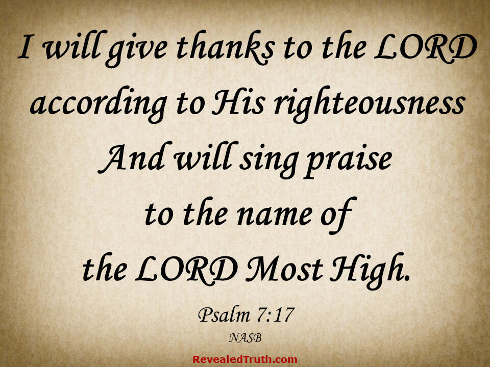 David gave thanks for God’s righteousness. Because he was confident in his faith, David praised God for being just and righteous: “17 I will give thanks to the Lord according to His righteousness and will sing praise to the name of the Lord Most High.” (Ps. 7:17). David knew that God would ultimately act out of His own righteousness. David had no righteousness to merit God’s intervention on his behalf. God does so only out of grace.